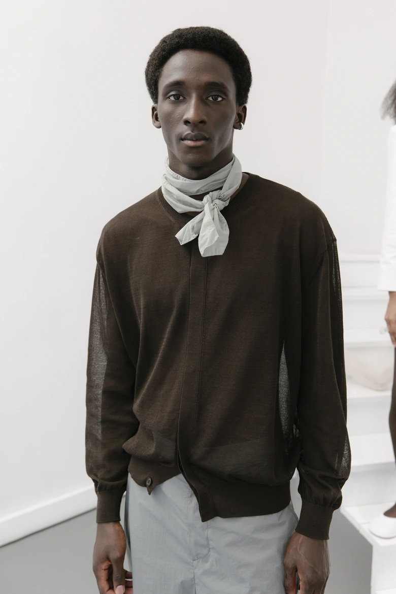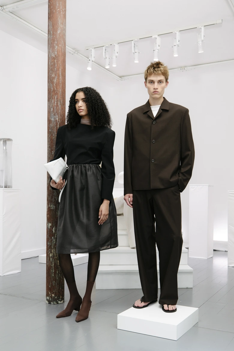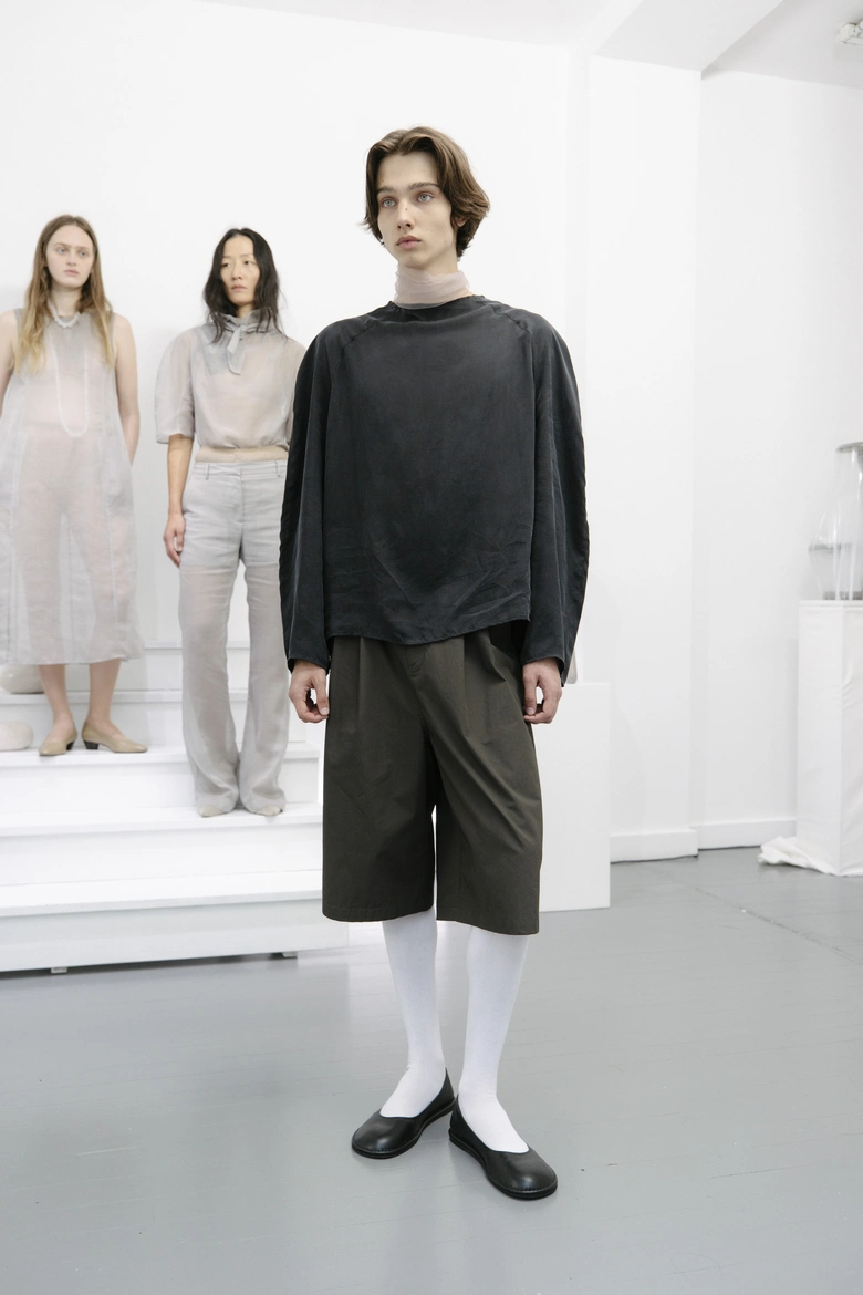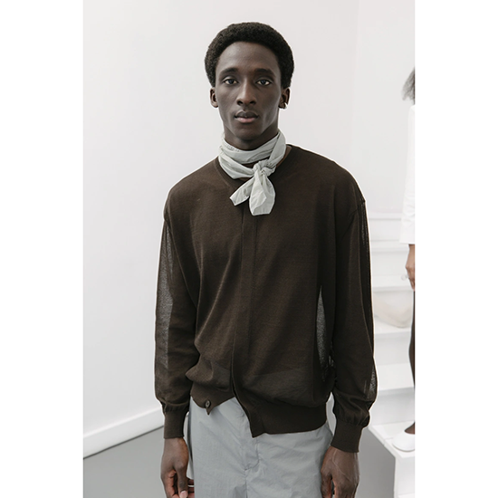 オーガンザやナイロンなどのシアーな素材が体を包み込み、シーズンのメッセージを強調している。サイドシームを用いないことや、ポケットをシームライン沿いに配置するなど、隠されたディテールがミニマリスティックなシルエットに焦点を当てている。カラーパレットは主に、ホワイトとダークブラウンを基調とし、グレー、チャコール、ブラックのニュートラルトーンで強弱のバリエーションを表現している。アクセントになるカラーパレットは、くすんだピンク、ビートレッド、シアンブルーでほんのり彩られ、過去と現在をつなぐ統一感のある色合いが生まれている。ブランド創立以降、一貫して示されてきた<AMOMENTO>の控えめなデザインの核と建築的なシルエットを、25SS コレクションを通して体験することができる。