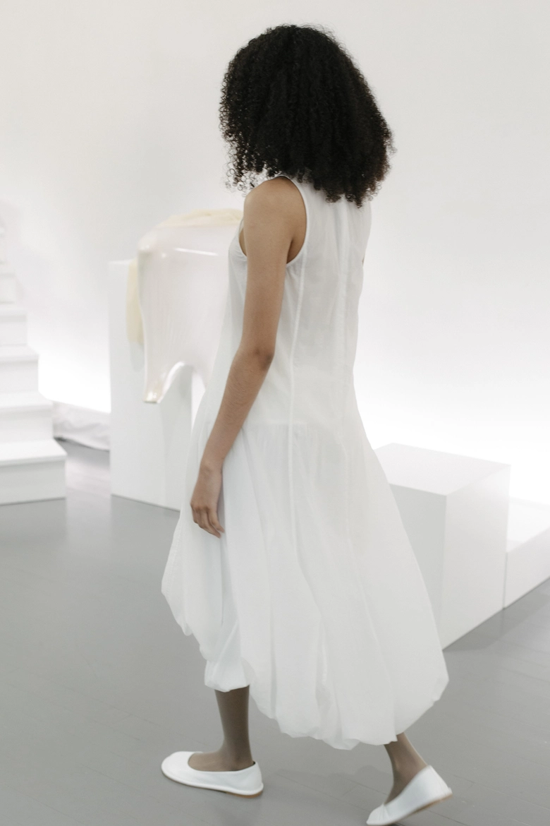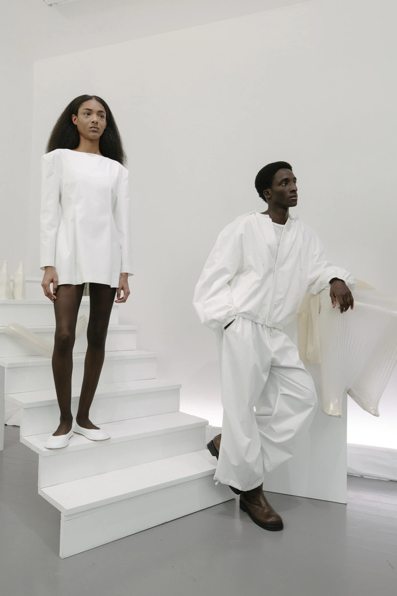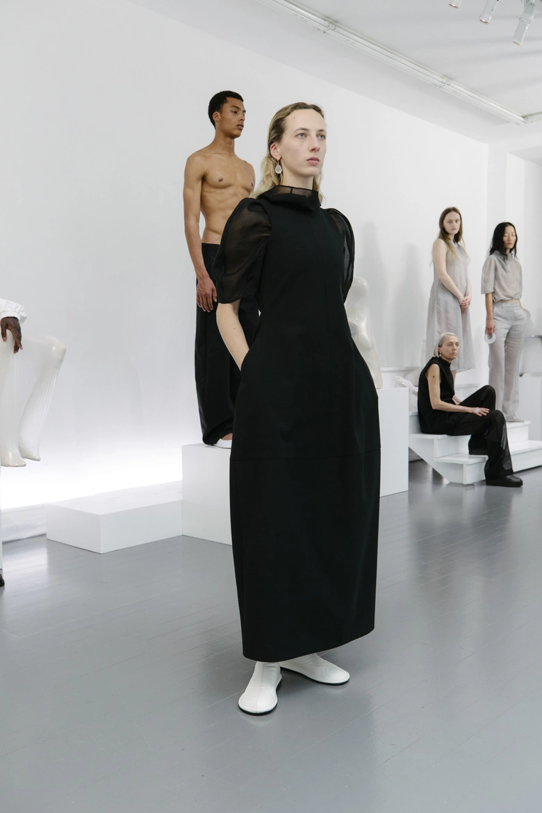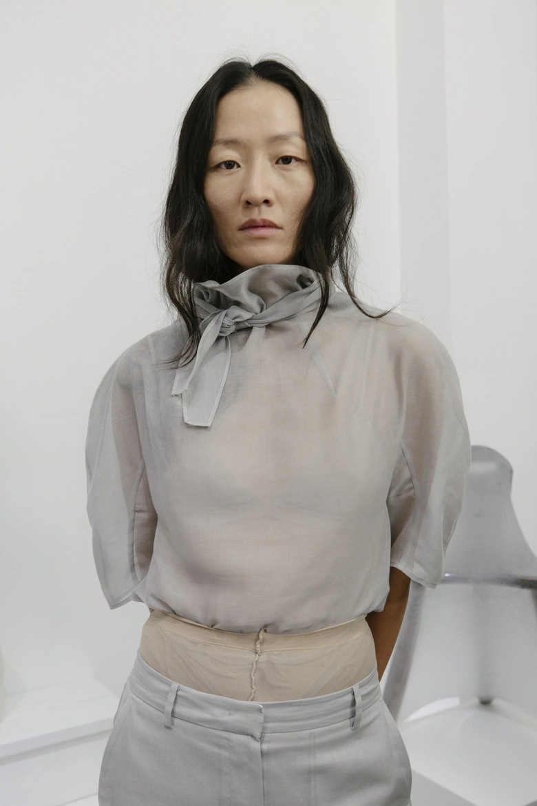 オーガンザやナイロンなどのシアーな素材が体を包み込み、シーズンのメッセージを強調している。サイドシームを用いないことや、ポケットをシームライン沿いに配置するなど、隠されたディテールがミニマリスティックなシルエットに焦点を当てている。カラーパレットは主に、ホワイトとダークブラウンを基調とし、グレー、チャコール、ブラックのニュートラルトーンで強弱のバリエーションを表現している。アクセントになるカラーパレットは、くすんだピンク、ビートレッド、シアンブルーでほんのり彩られ、過去と現在をつなぐ統一感のある色合いが生まれている。ブランド創立以降、一貫して示されてきた<AMOMENTO>の控えめなデザインの核と建築的なシルエットを、25SS コレクションを通して体験することができる。