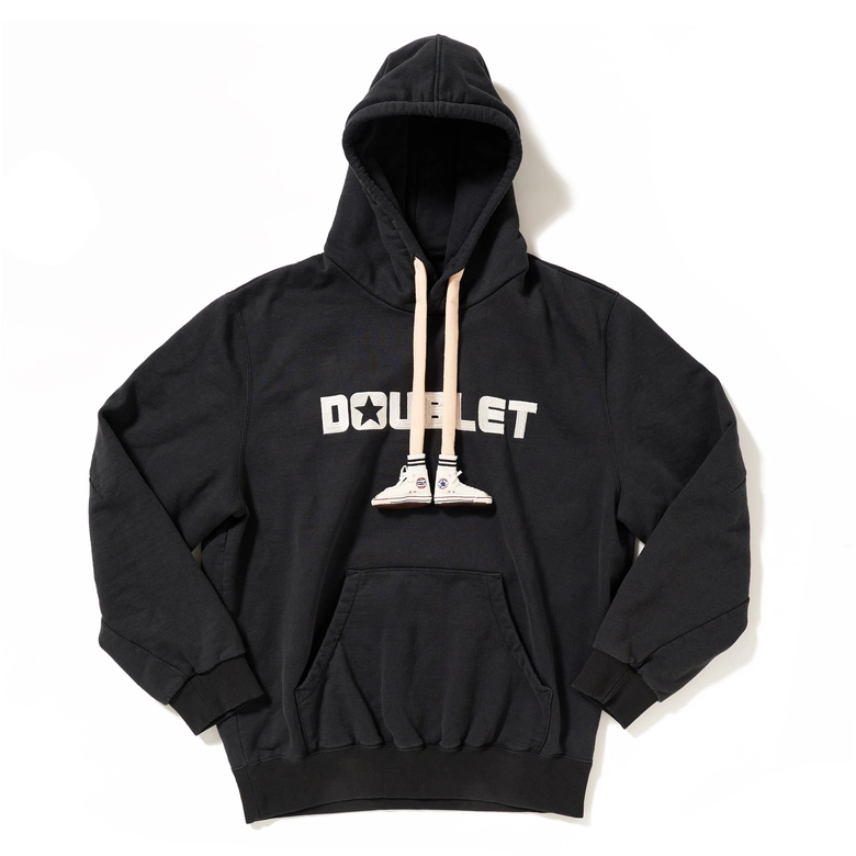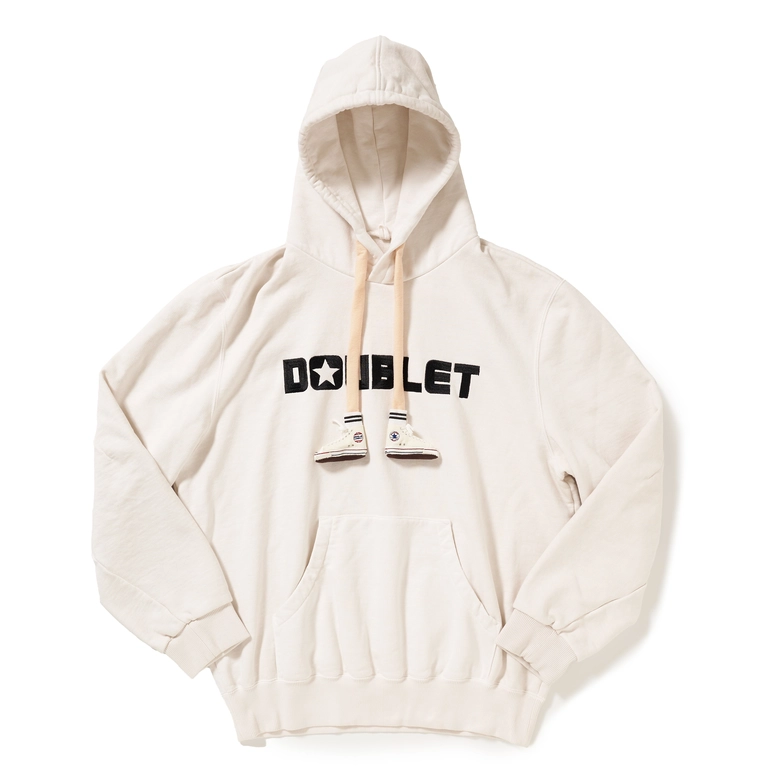 シューズメーカー コンバースとのコラボレーションを記念して製作されたフーディー。繊細な手芸によってリアルに再現された”JACK PARCELL ALL STAR"を履いている足が、フード紐としてぶら下がっている独特なデザイン。