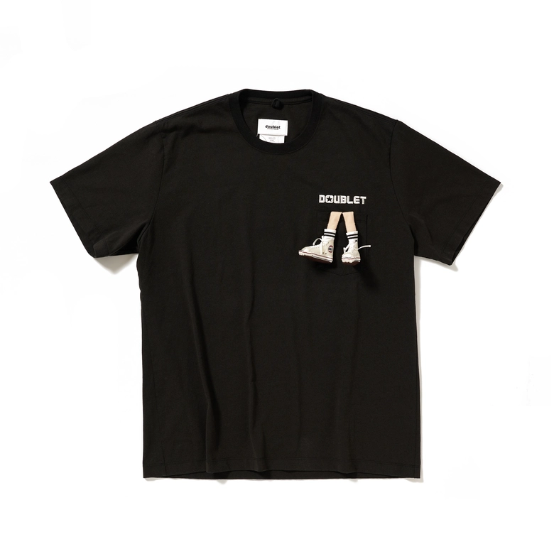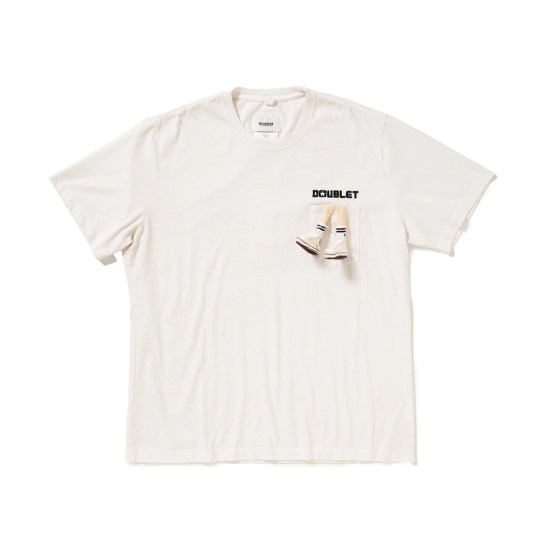 シューズメーカー コンバースとのコラボレーションを記念して製作されたTシャツ。繊細な手芸によってリアルに再現された”JACK PARCELL ALL STAR"を履いている足が、胸ポケットから飛び出す独特なデザイン。