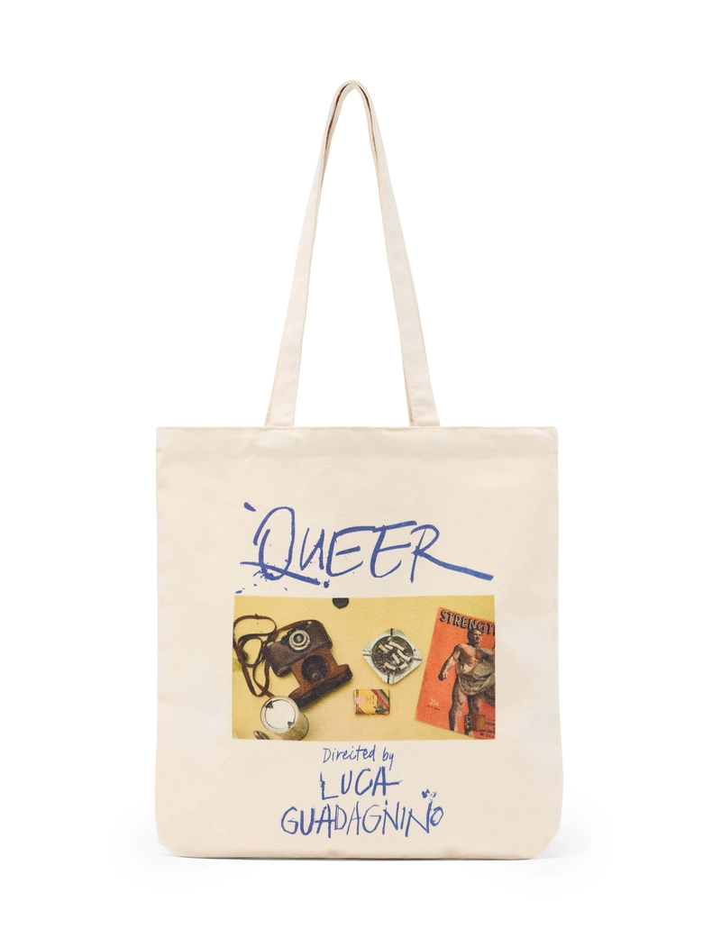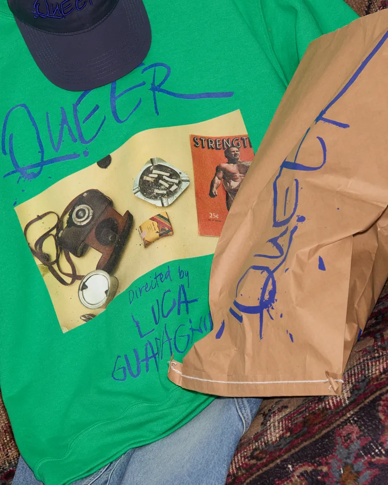 アクセサリーも充実しており、オフホワイトのトートバッグには映画から採用した画像がプリントされ、カーキとネイビーの2色展開のキャップには『QUEER』のタイトルが刻まれている。