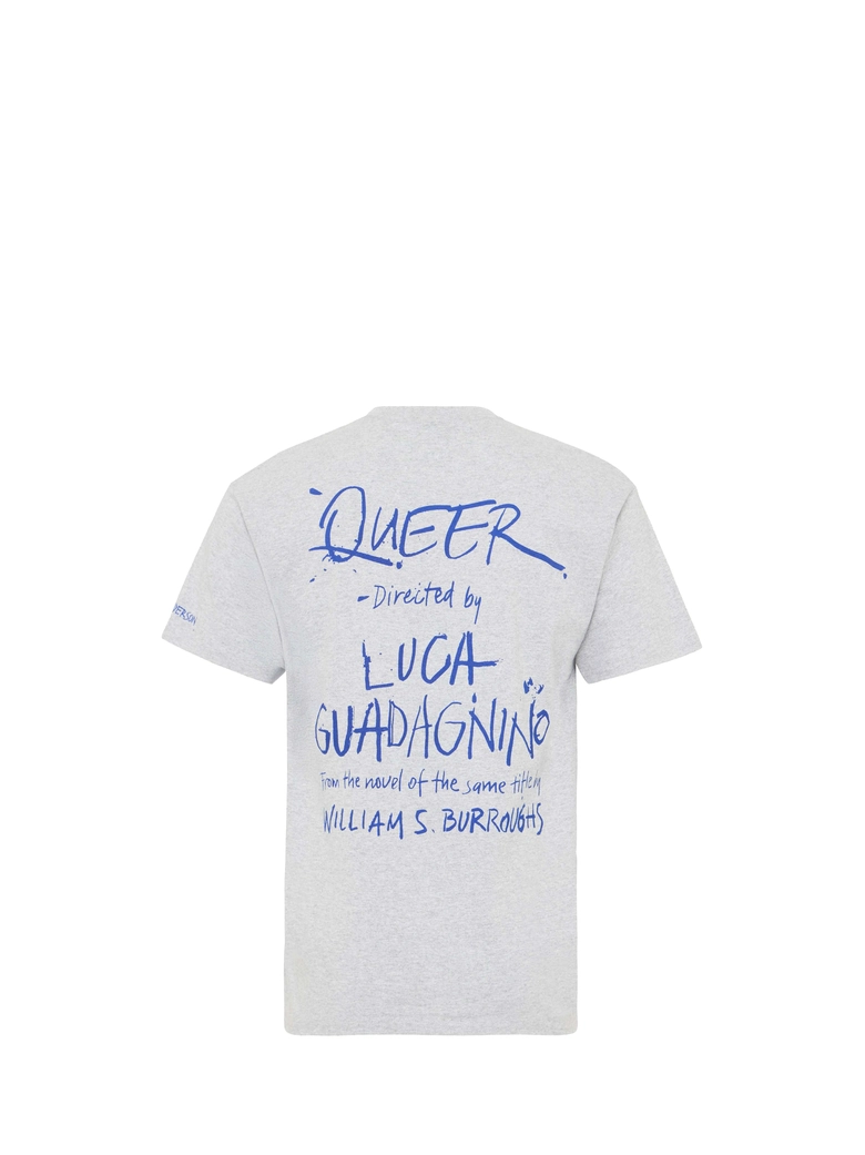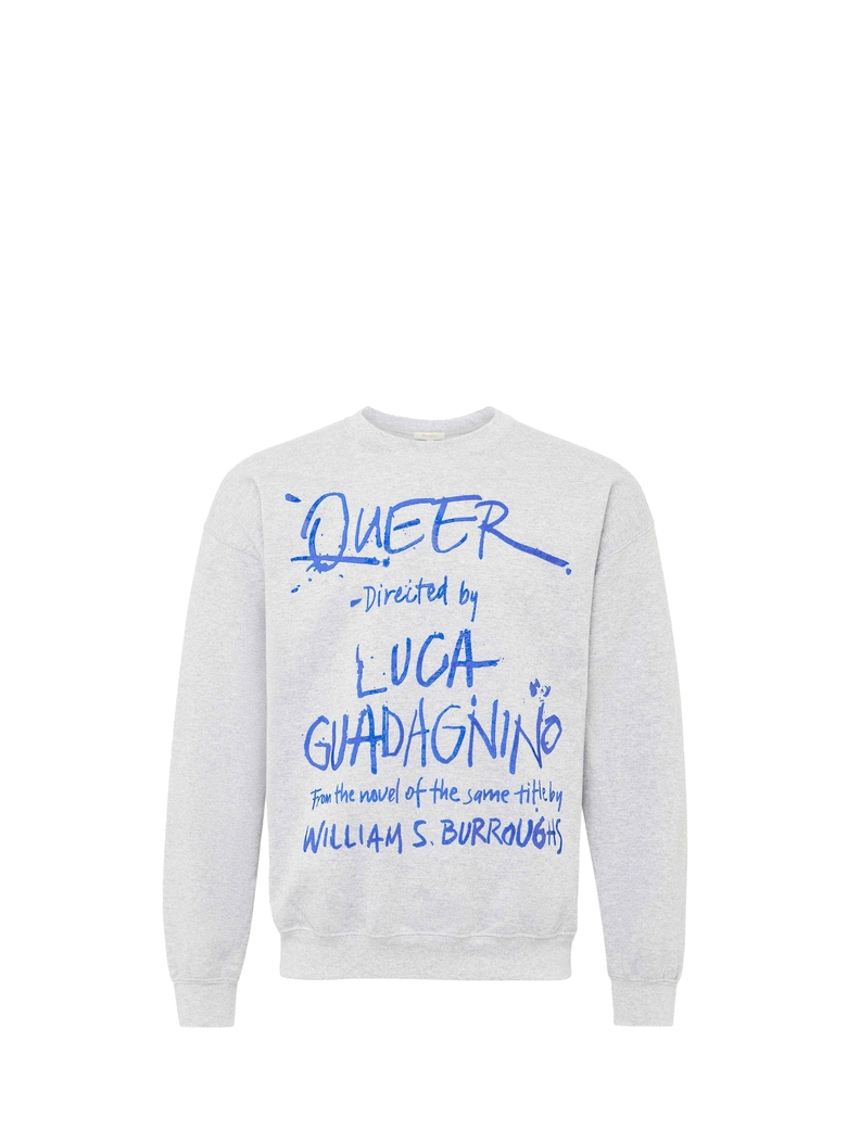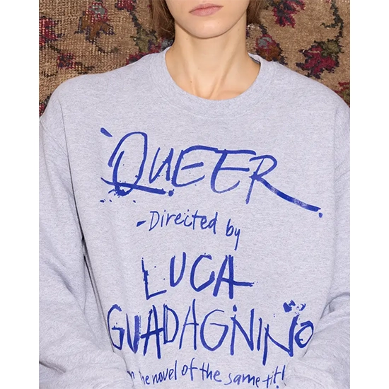 コレクションでは、映画のポスターやメインビジュアル、作品のテーマをモチーフにしたグラフィックをウェアやアクセサリーに落とし込んでいる。注目アイテムには、グレーのフーディーに「QUEER」の文字をプリントし、ビーズで装飾されたドローストリングをあしらったパーカーや、公式ポスターを彷彿とさせるタイトルとクレジットがデザインされたクルーネックスウェットがラインナップ。