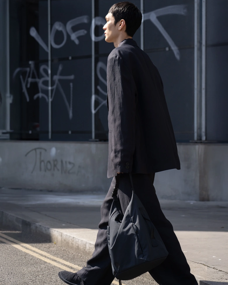 <STUDIO NICHOLSON>のパンツにインスパイアされたサイドファスナーを模したディテールを採用。吉田カバンならではの拡張マチ機能が装備され、デザイン性と実用性を両立している。