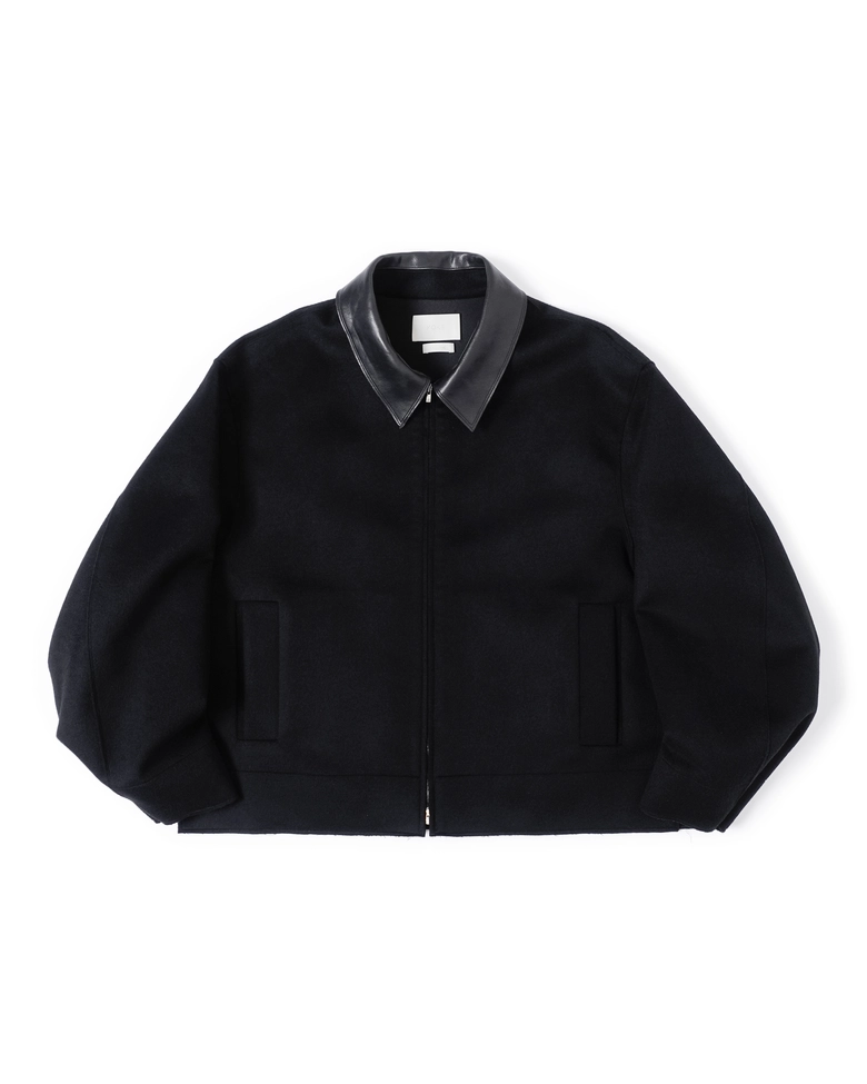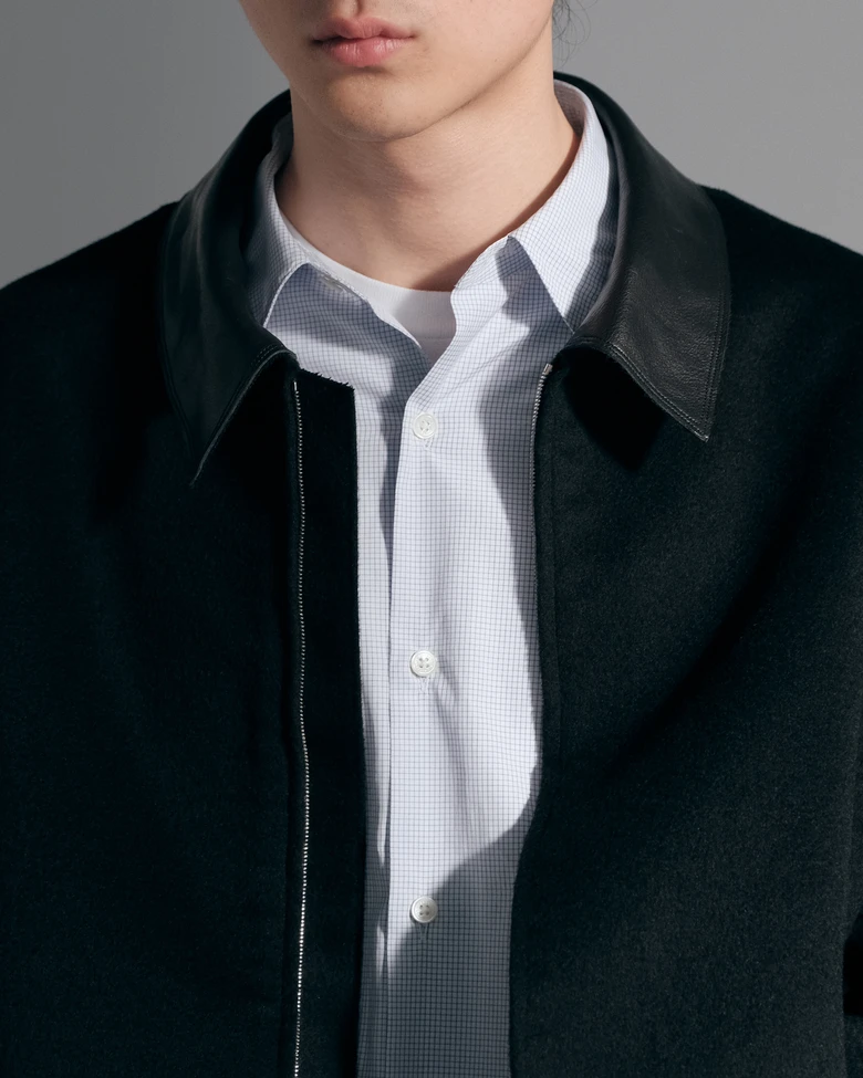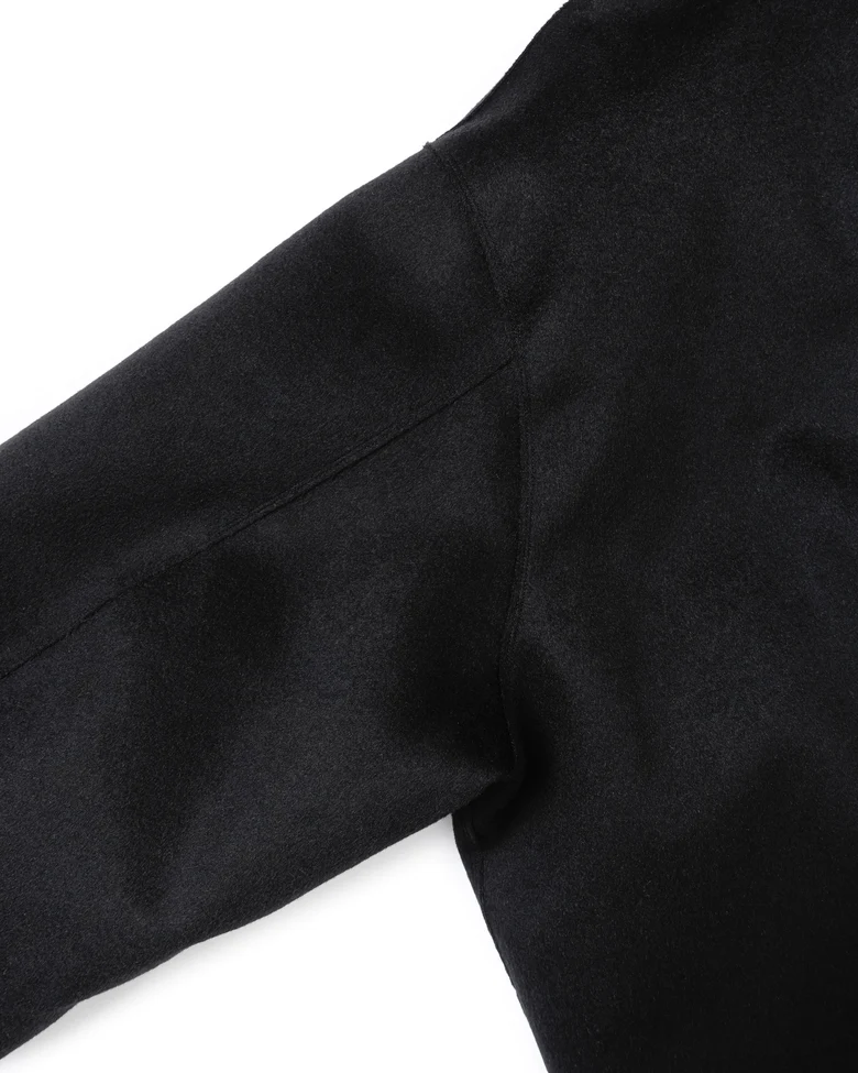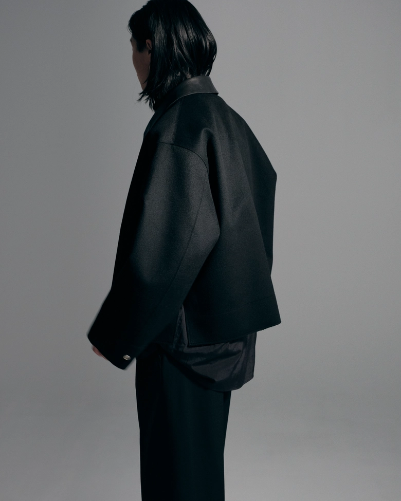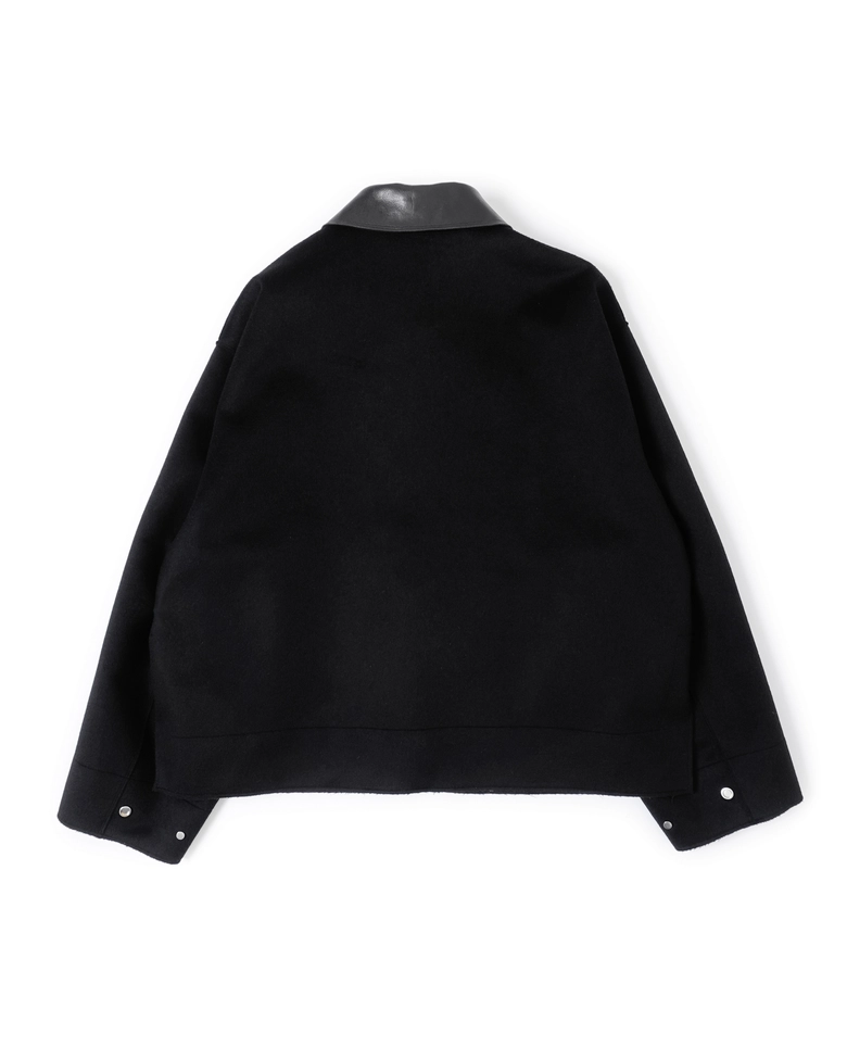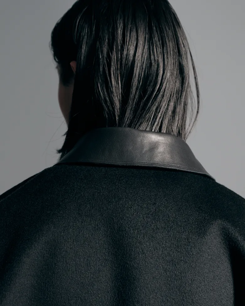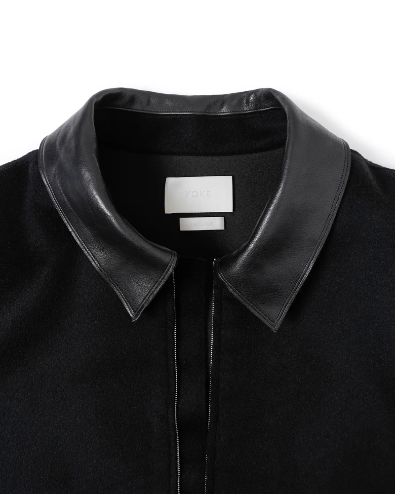 ボディにはビーバー仕上げのカシミヤを採用。高密度に織り上げた後に、高級加工であるシャルム加工を施すことで優雅な肌触りとドレープ性を極限まで引き上げている。また、襟部分をカウレザーに変更。着ていくほどにアタリや光沢が増し柔らかく経年変化をしていく様に仕上げている。