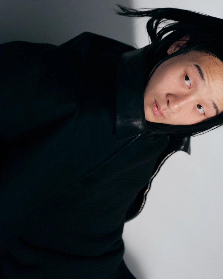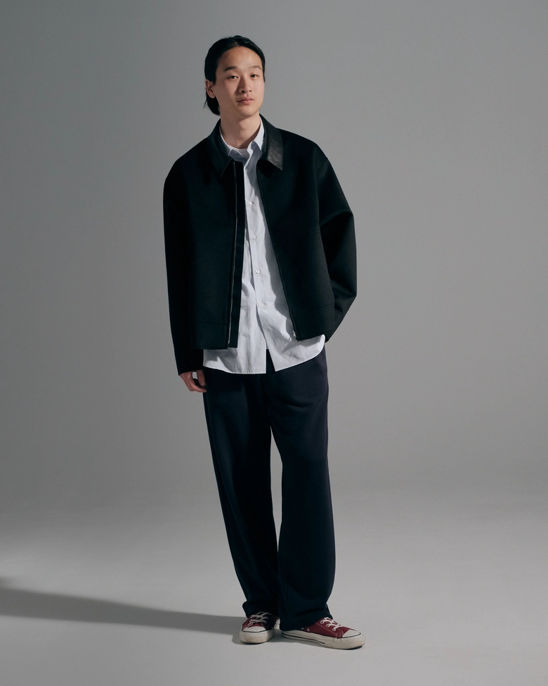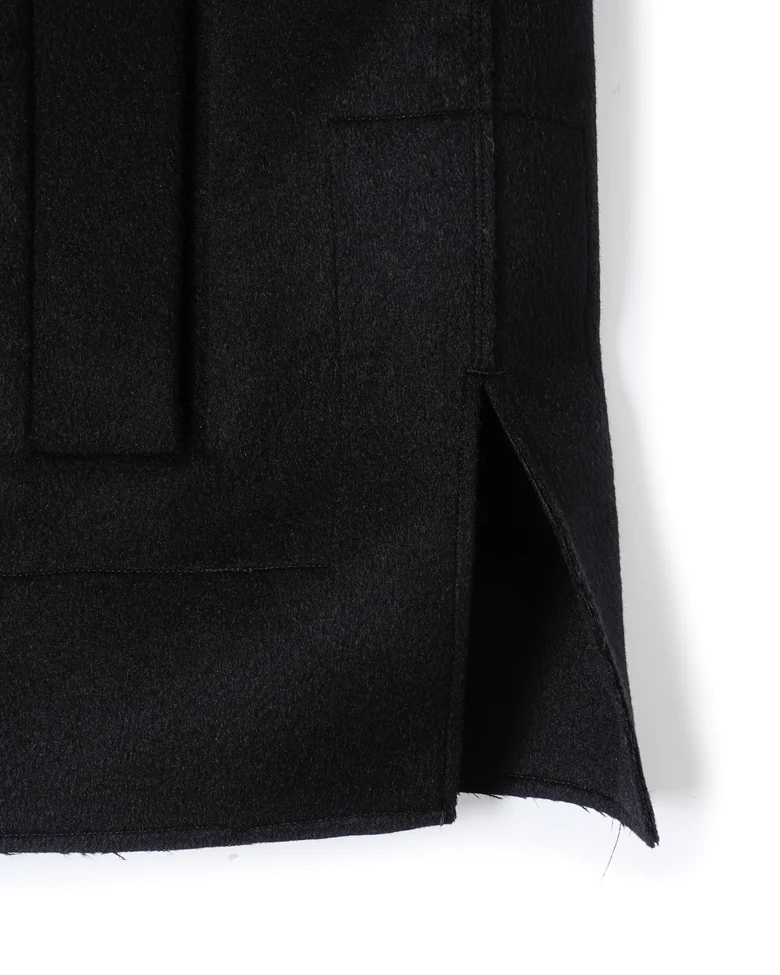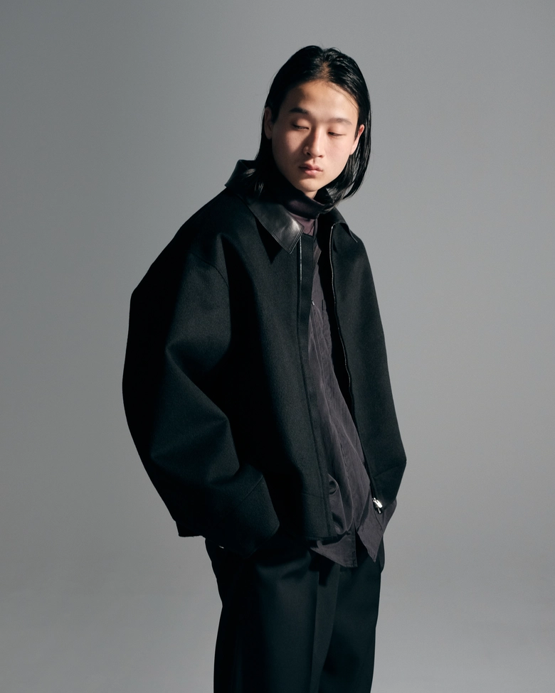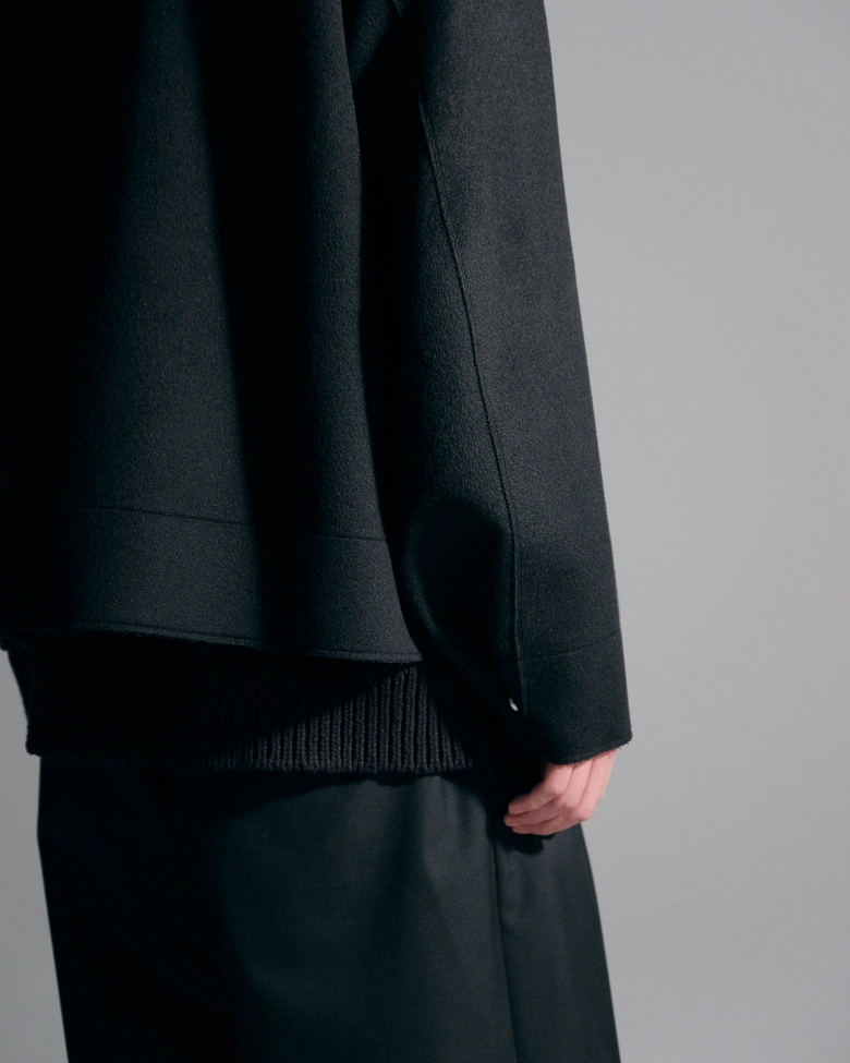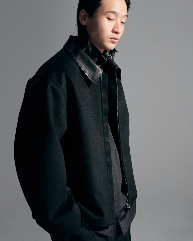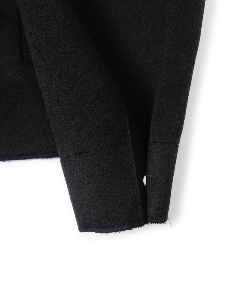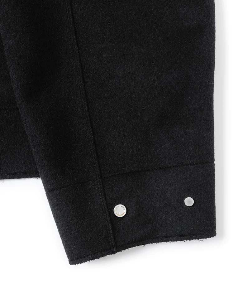 ボディにはビーバー仕上げのカシミヤを採用。高密度に織り上げた後に、高級加工であるシャルム加工を施すことで優雅な肌触りとドレープ性を極限まで引き上げている。また、襟部分をカウレザーに変更。着ていくほどにアタリや光沢が増し柔らかく経年変化をしていく様に仕上げている。