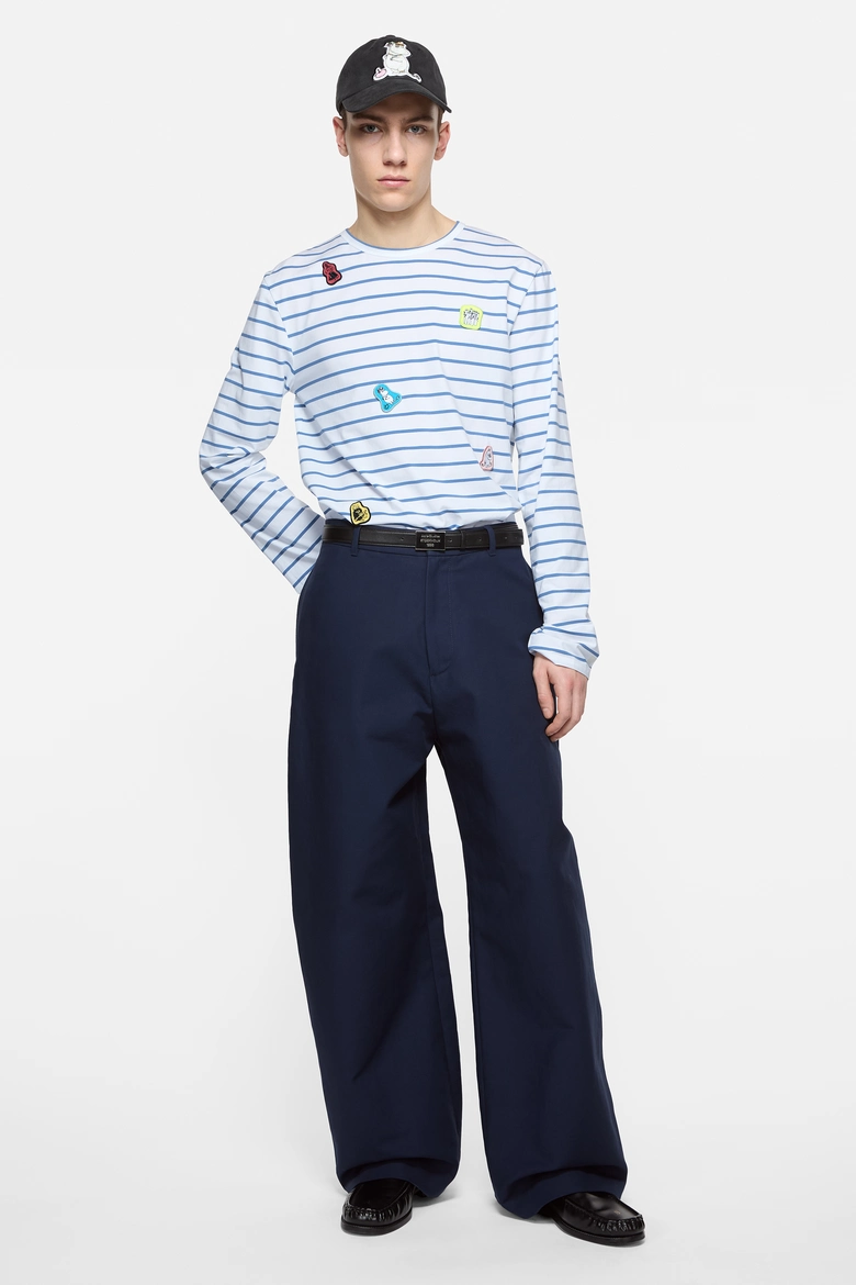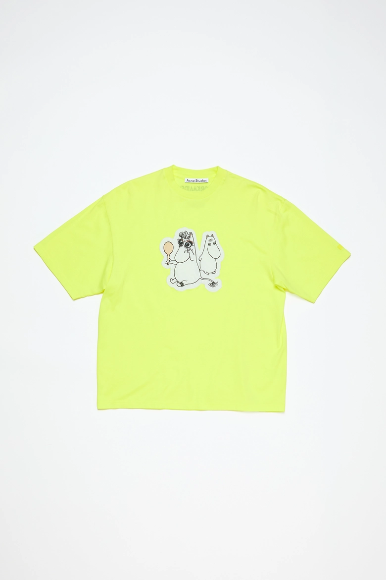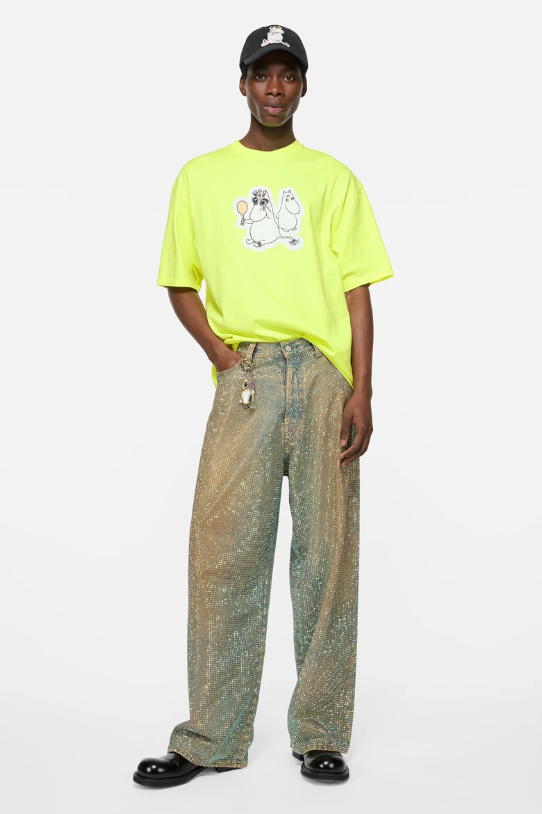 若々しい自己表現をテーマに掲げた本コレクションでは、Moominsのユートピア的なキャラクターたちと、リラックス感あるユニセックスなスタイル、そしてアシッドイエローやベビーピンクといった鮮やかなカラーが融合している。Little My(リトルミイ)、Snorkmaiden(スノークのおじょうさん)、Stinky(スティンキー)、Hattifatteners(ニョロニョロ)などのおなじみのキャラクターが、ストライプシャツ、1981ジーンズ、Tシャツ、スウェット、ニットウェア、ベースボールキャップなどのアイテムにプリントやワッペンとして登場。また、クラシックなレースアップスニーカーには取り外し可能な金属製のムーミンパッチが付き、カスタマイズが楽しめる仕様になっている。キーホルダーにはチャームがあしらわれ、遊び心が加えられている。さらに、Acne Studiosのシグネチャーである“Face”ロゴもウェアの小さなパッチやスニーカーのワンポイントとして登場する。