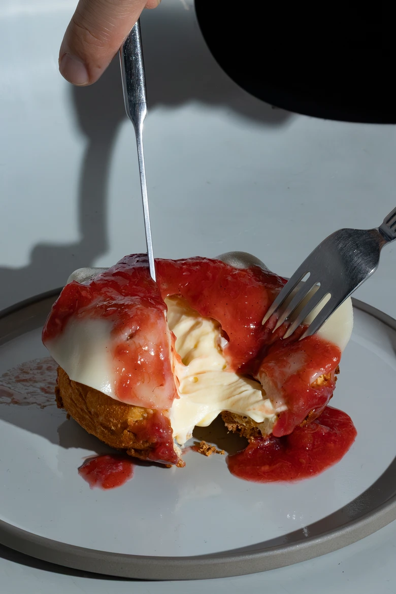 さらに、伝統菓子Kartoffelkage(カルトフルケーケ)を<NOMU>流にアレンジしたスイーツも登場。カスタードクリーム入りのシューにマジパンをかぶせ、甘酸っぱいルバーブソースで仕上げた一品は、見た目も味も軽やかで夏向け。