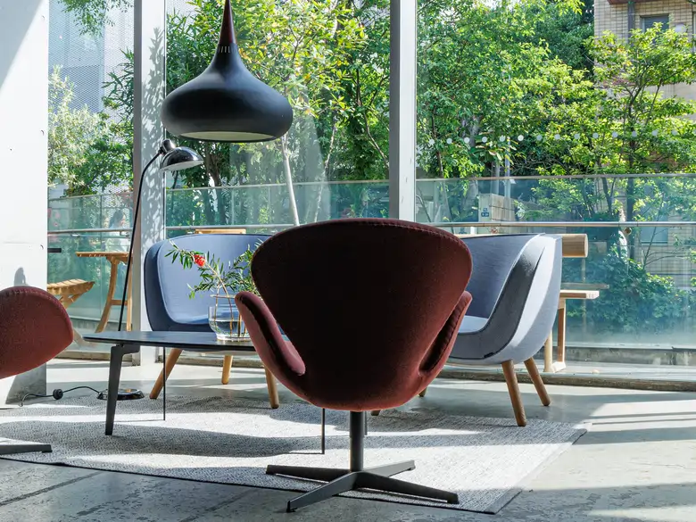 また今回の展示家具の一部には、<FRITZ HANSEN>のサーキュラープログラムにより回収・再利用されたチェアが使用されており、サステナビリティの視点からも注目の取り組みとなっている。