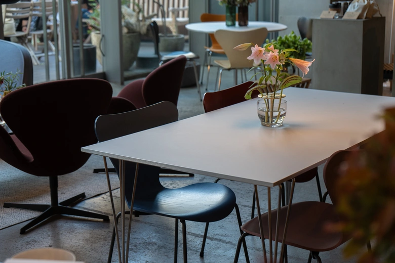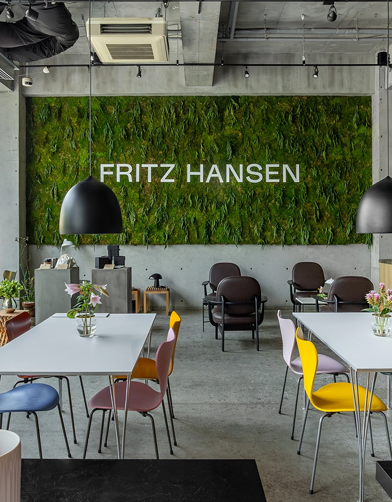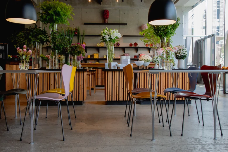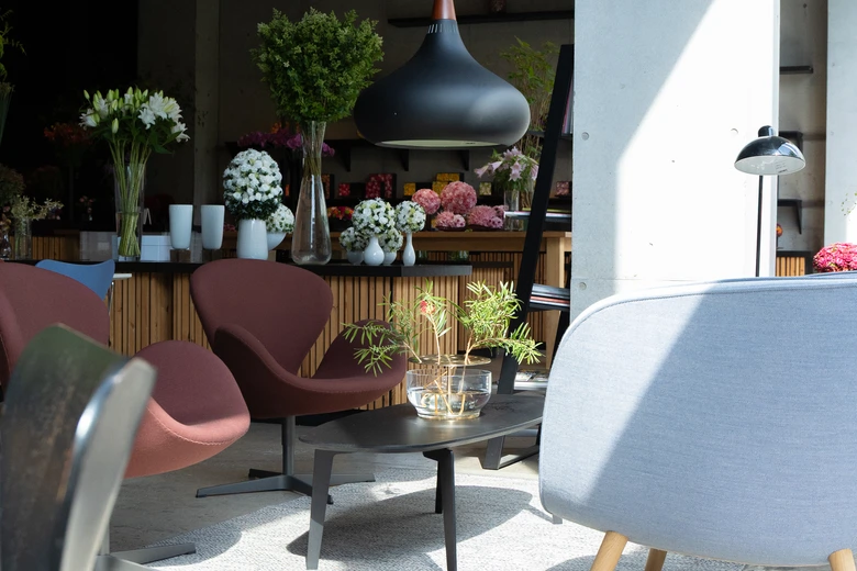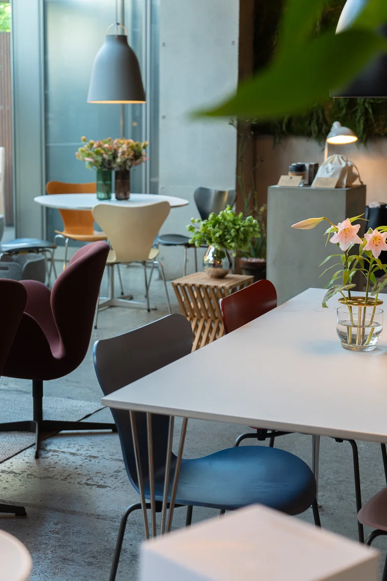デンマークを代表する家具ブランド<FRITZ HANSEN(フリッツ・ハンセン)>のセブンチェアやスワンチェアが店内に並び、インテリアに合わせた花々が彩る空間が登場。洗練された北欧デザインとフラワーアートが調和し、訪れる人にデンマーク流の「ヒュッゲ」な時間を提供する。