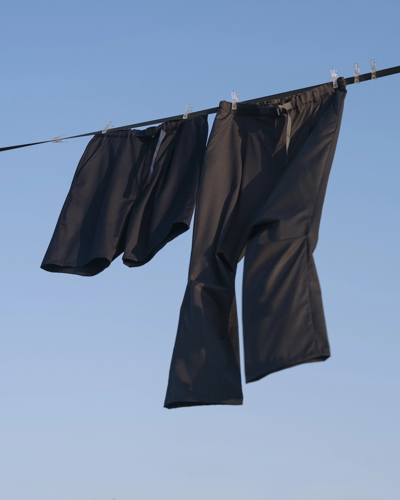 腰と太もも周りにゆとりを持たせたワイドストレートタイプの「WALKER ST EASY PANTS」と「WALKER EASY SHORTS」をラインナップ。<nonnative>ならではの立体的なカッティングに、上質で滑らかな生地を合わせることで、美しく動きのあるシルエットを実現している。ガゼットクロッチやウェビングベルトなど<Gramicci>ならではのディティールは踏襲しつつ、まるで上品なウールスラックスのように仕上げられている。長く続くコラボレーションの中でも、最も贅沢なパンツとショーツが完成した。
