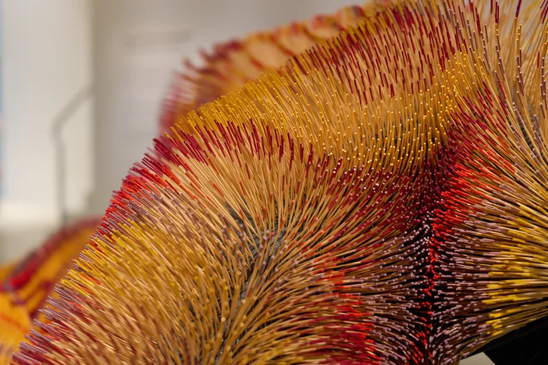 特に注目すべきは、手作業で先端に色をつけた60,000本の竹串を使用し、一本一本を手で並べた「Skewer Carpet 2」。さらに、本展で初公開となる新作として、「Skewer Carpet 2 (extension)」「Skewer Carpet 3」「Pin Carpets 7-10」が登場する。中でも「Pin Carpets 7-10」は、スポンジをベースにシルバーとゴールドのまち針を刺した作品で、服づくりに必要な道具を用いながら、素材の形状変化による繊細な表情の変化を表現している。