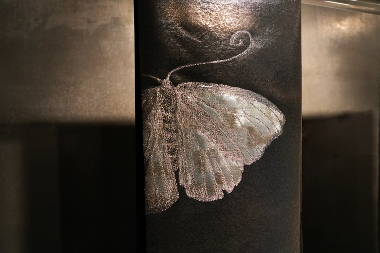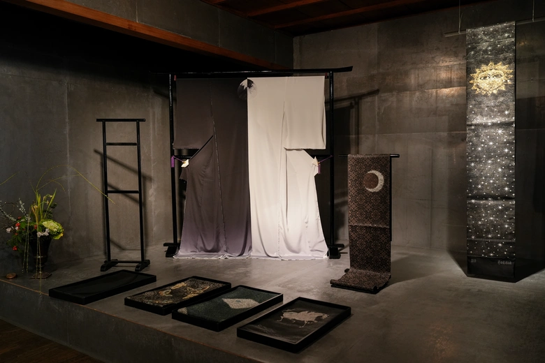 アパレルブランドとの協業からスタートした誉田屋源兵衛の浴衣は浴衣のイメージを覆す斬新な柄が特徴である。国内で綿、麻に留まらず大麻や紙など原料から吟味した生地を特別に織り、京都や鳴海で伝統的な技法をベースに染めあげている。華やかな箔使いやビビッドな配色、そしてその奥に息づく文様の意味世界を楽しめる機会となっている。
