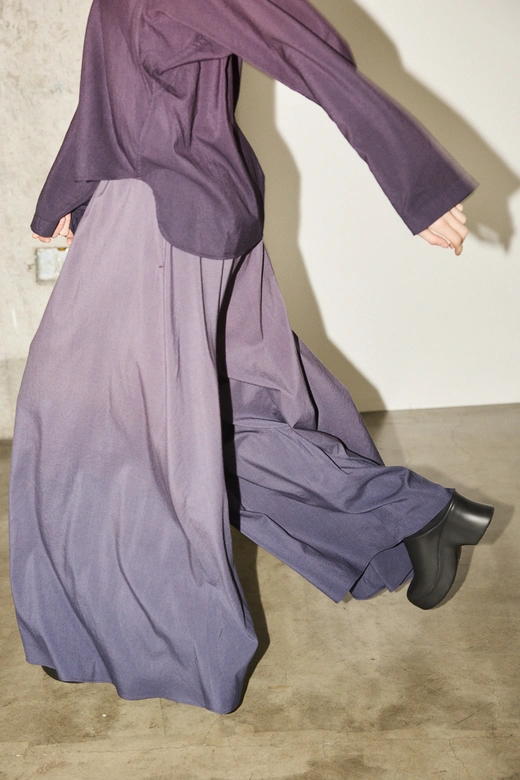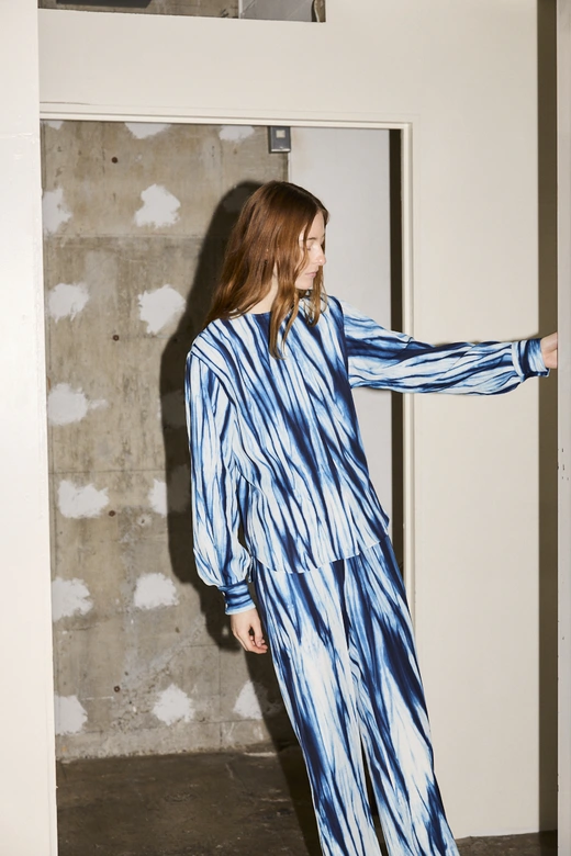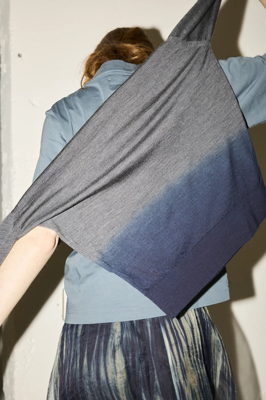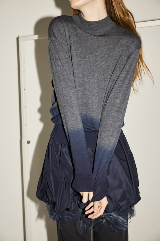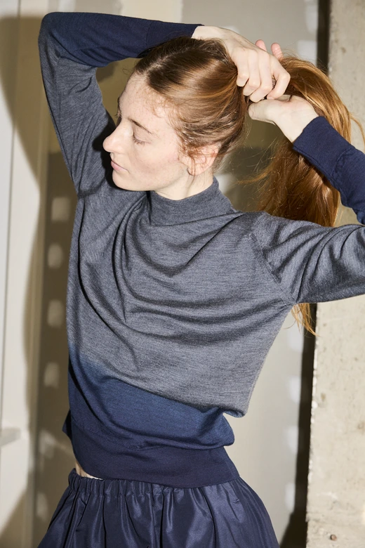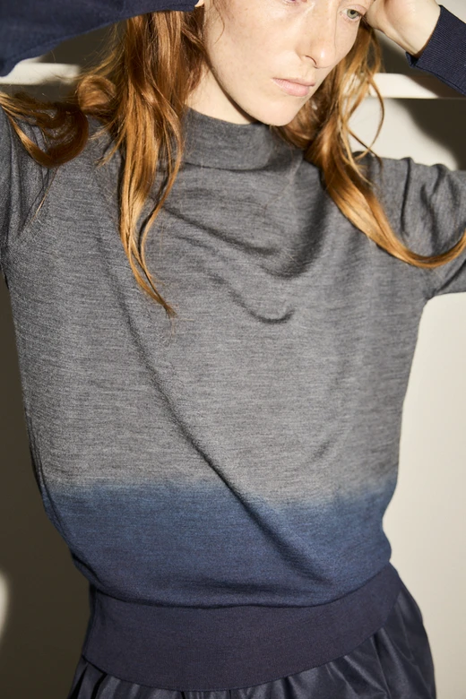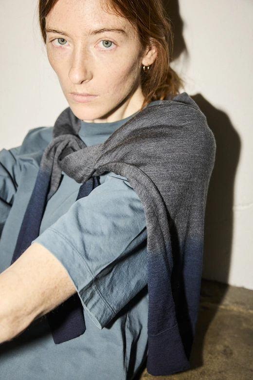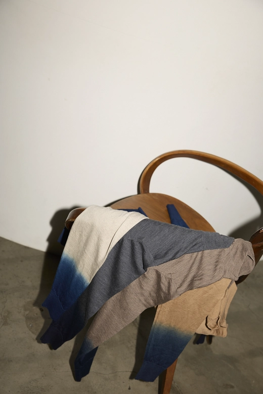 本コレクションでは、<JOHN SMEDLEY>の人気モックネックモデル「AMITY」をベースに、<ŌME>ならではの藍によるグラデーション染めを施されている。クラシックなソリッドカラーとは一線を画す、奥行きのある風合いが見どころである。
