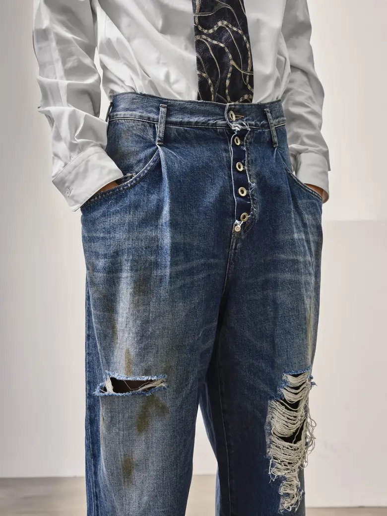 今回登場する別注アイテムは、<SOSHIOTSUKI>の2025年春夏コレクションにて発表された「DRAPE POCKET TUCKED DENIM」をベースに、2023年春夏で話題となったオイル加工モデルと、2022年春夏コレクションで発表されたダメージデニムを再現したダメージ加工モデルの2型を展開。