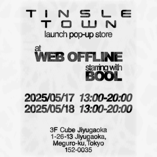 <tinsletown>は、実際にアーティストが着用するステージ衣装をコンセプトに、国内外から厳選されたヴィンテージおよびユーズドアイテムを取り扱うセレクトショップ。音楽と密接にリンクするファッションを軸に、DJやアーティストとのコラボポップアップも今後継続的に展開予定となっており、ミュージックカルチャーとファッションの架け橋となる新たな発信拠点として注目を集めている。