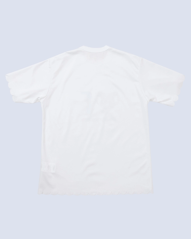 今回のアイテムは、村上隆氏の「言い訳ペインティング」から着想を得た“吹き出し”モチーフのスカラップカッティング仕様ポケットTシャツ。「SPEECH BUBBLES POCKET T-SHIRT」と題された本作には、<TSTS>オリジナルemojiと、<DSMG>限定の「白い象」emojiグラフィックが配されている。ブラックとホワイトの2色展開で、グラフィックのユニークさと共に、シルエットやディテールにもこだわりが感じられる一枚だ。