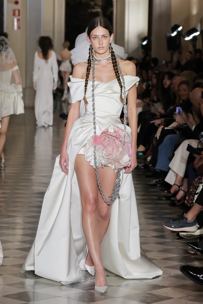 象徴的なコルセットデザインや、テーラリングにマスキュリンな要素を加えたルックのほか、「Absence of roses」と題されたジャカード素材のクラシカルなドレス、洗いをかけたジョーゼットやシフォンなど多彩な素材が使用されており、過去・現在・未来が交錯するようなポプリ的世界観が体現された。