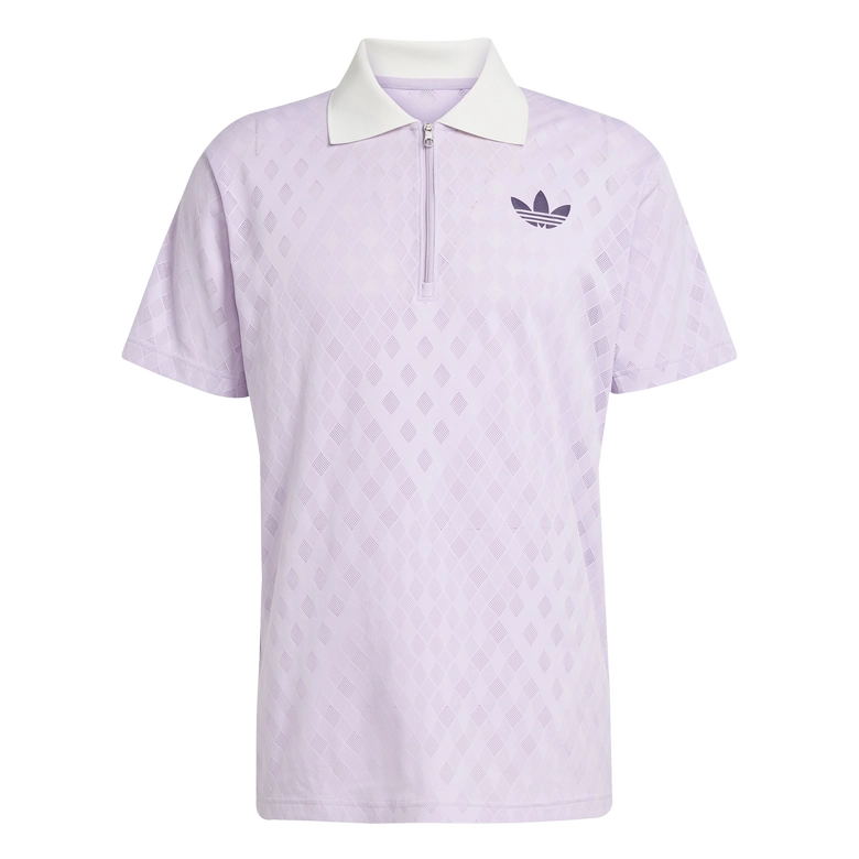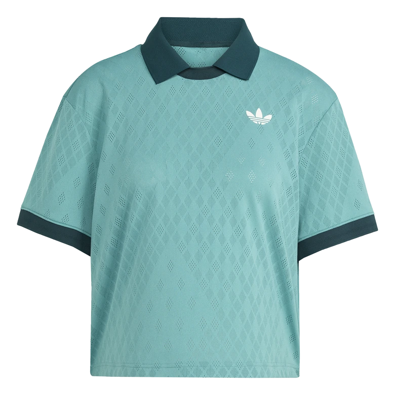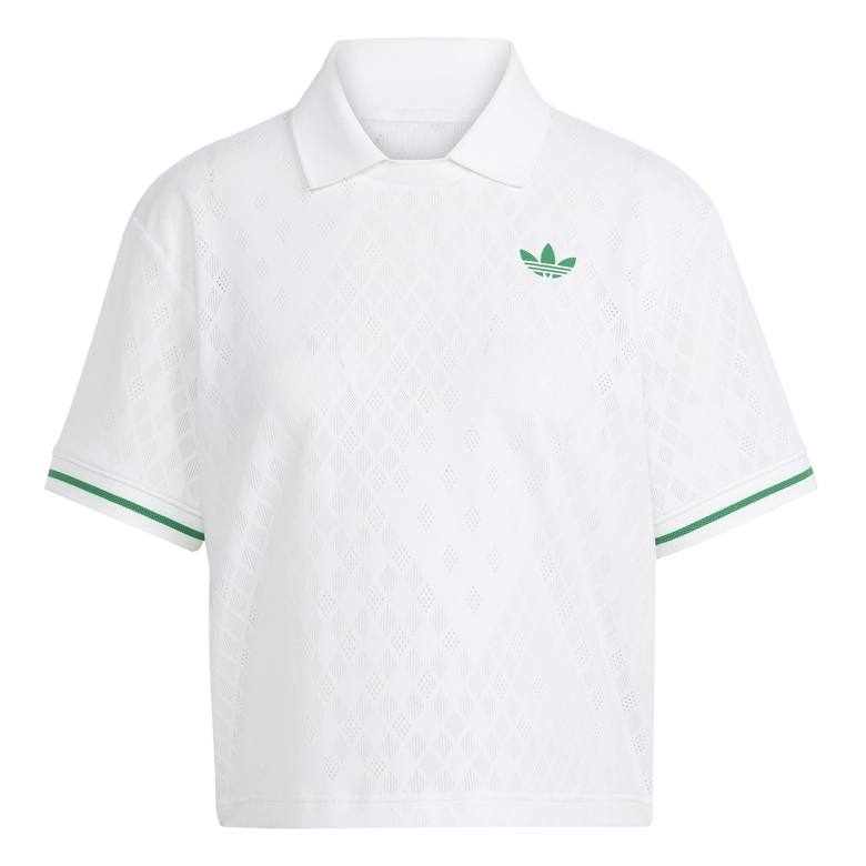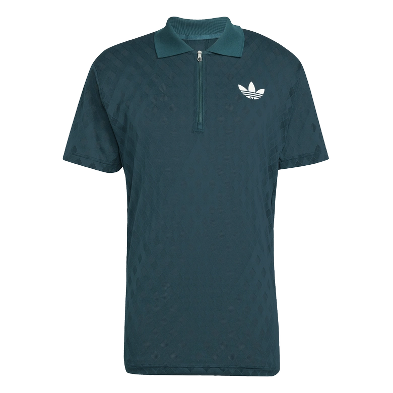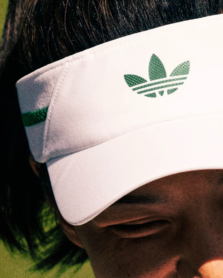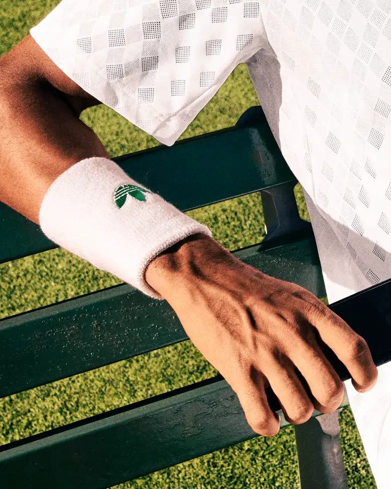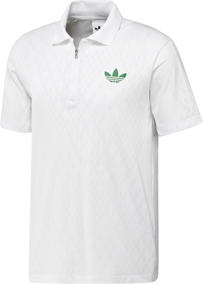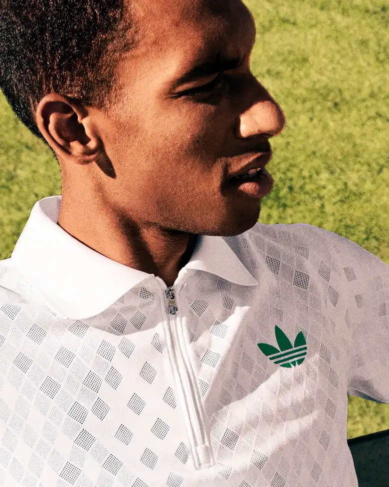 今回のコレクションでは、長年のドレスコードであるホワイトをベースに、フレッシュな視点で新しいカットやシルエットを探求されている。スタン・スミスをはじめとするレジェンドたちによって有名となった1970年代テニスファッションの定番であるオープンカラーを採用しながら、大会の天然芝を思わせる鮮やかなグリーンで、トレフォイルロゴやコントラストの効いたステッチを施している。さらにポロシャツのアーガイルチェック風パターンや、テニスボールのモチーフが印象的なジッパープルなど、独特のデザインディテールを施したアイテムも登場した。
