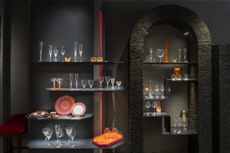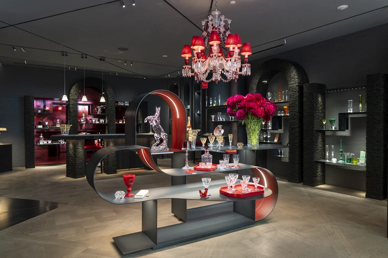 空間デザインはパリを拠点とする著名なデザイン事務所<Moinard Bétaille(モワナール・ベタイユ)>が手がけ、クリスタルを生み出す4つの元素(火、水、空気、土)をモチーフに構成されている。アーチ形のディスプレイはマニュファクチュールへのオマージュであり、赤いバブルミラーが印象的なビジュアルを演出する。