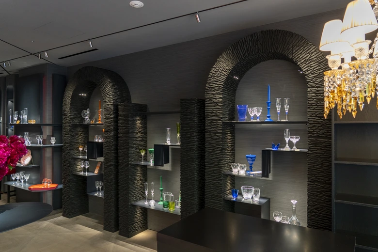 また、トランク型のキャビネットには、19世紀の万国博覧会を想起させるレアな品々が展示され、バカラの長い歴史に触れることができる。ショップの左ファサードには、シーズンごとにテーマが変わるディスプレイボックスが設置され、訪れるたびに新たな発見がある。