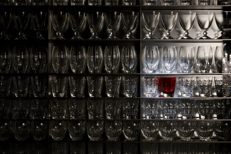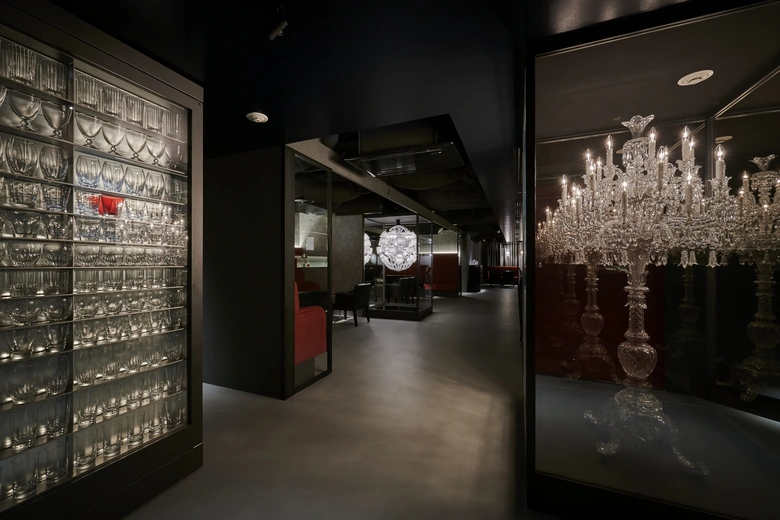 赤のグラスや岩谷堂箪笥など、異なる素材で“赤”を表現した空間は、静謐の中に情熱を感じさせる美意識が宿る。通路には、バカラ村のマニュファクチュールやクリスタル制作の風景を収めた写真が額装展示され、視覚的にも伝統とクラフツマンシップを味わえる。