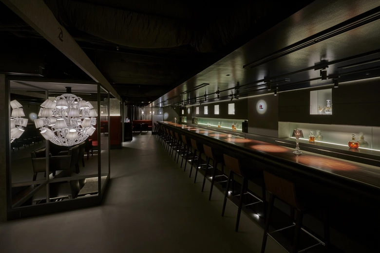 「B bar Marunouchi」は、新東京ビルB1階に1.6倍の広さでリニューアル。シャンデリアと深紅のソファが配されたラグジュアリーな空間で、バカラグラスを使用した特別な一杯を楽しむことができる。象徴的な燭台「ツァリーヌ」がエントランスに佇み、200種を超えるバカラグラスが並ぶ「バカラの壁」がゲストを迎える。旧店舗のバーカウンターを引き継ぎつつ、本革レザーのアームレストや椅子の高さなど、細やかな配慮が施され、快適な時間を過ごせるよう設計されている。