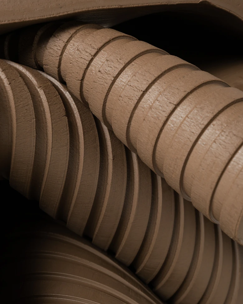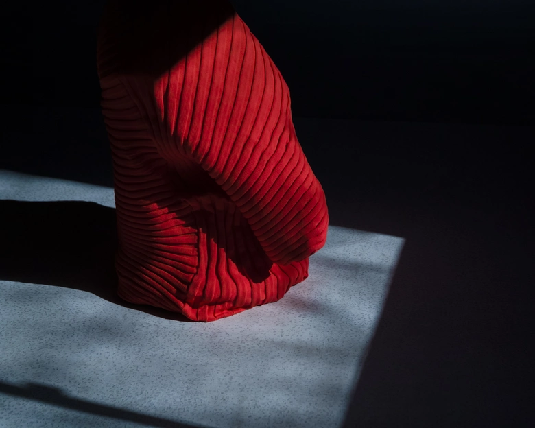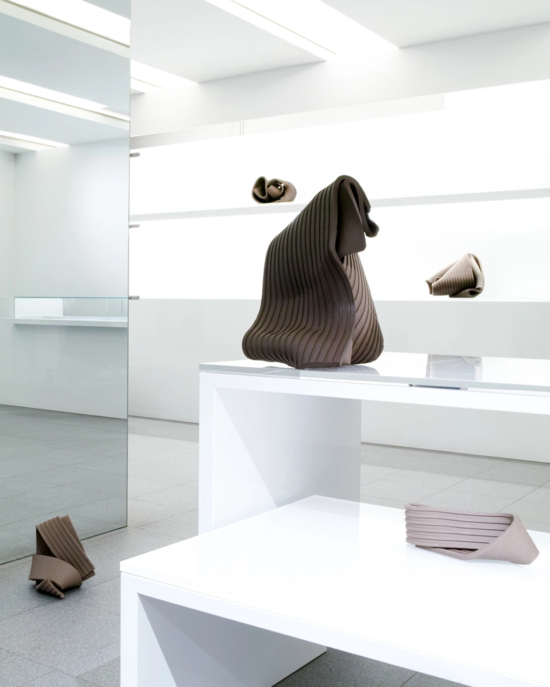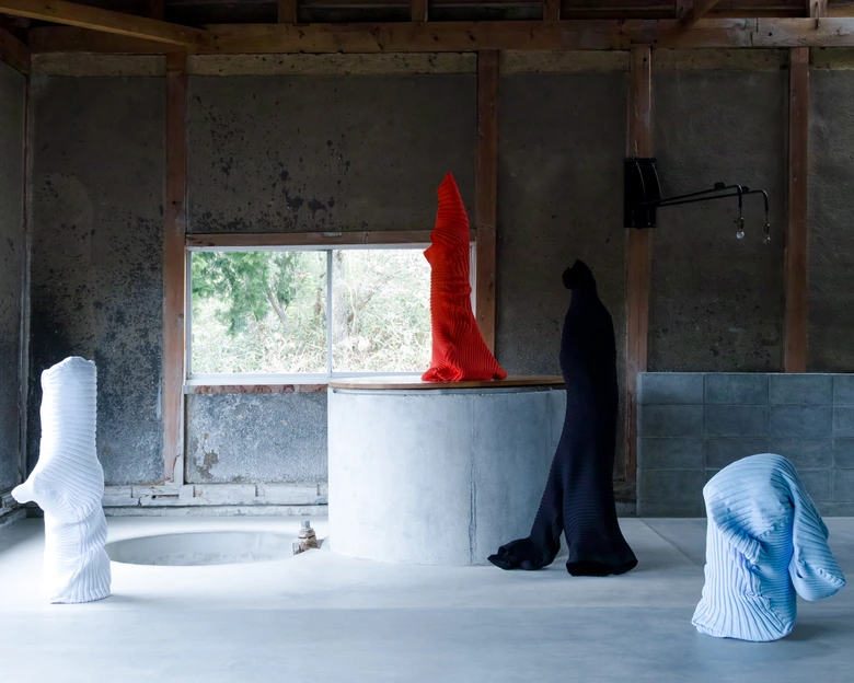 それぞれ異なる空間性を持つ会場が互いに補い合い、交じり合うようなインスタレーション展示を行うことで、衣服と陶芸の境界を探る。展示空間には、赤や黒、ピンク、ブラウンなど多彩な色調のプリーツファブリックが陶器のような彫刻的造形で配置され、視覚的にも触感的にもその曖昧さを体験できる構成となっている。