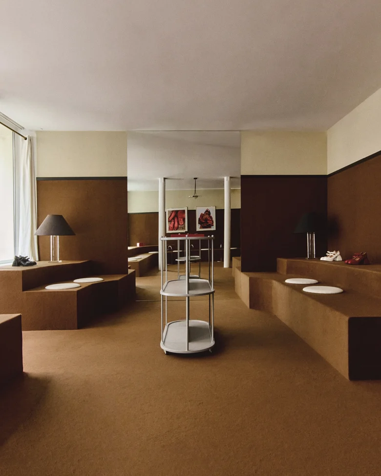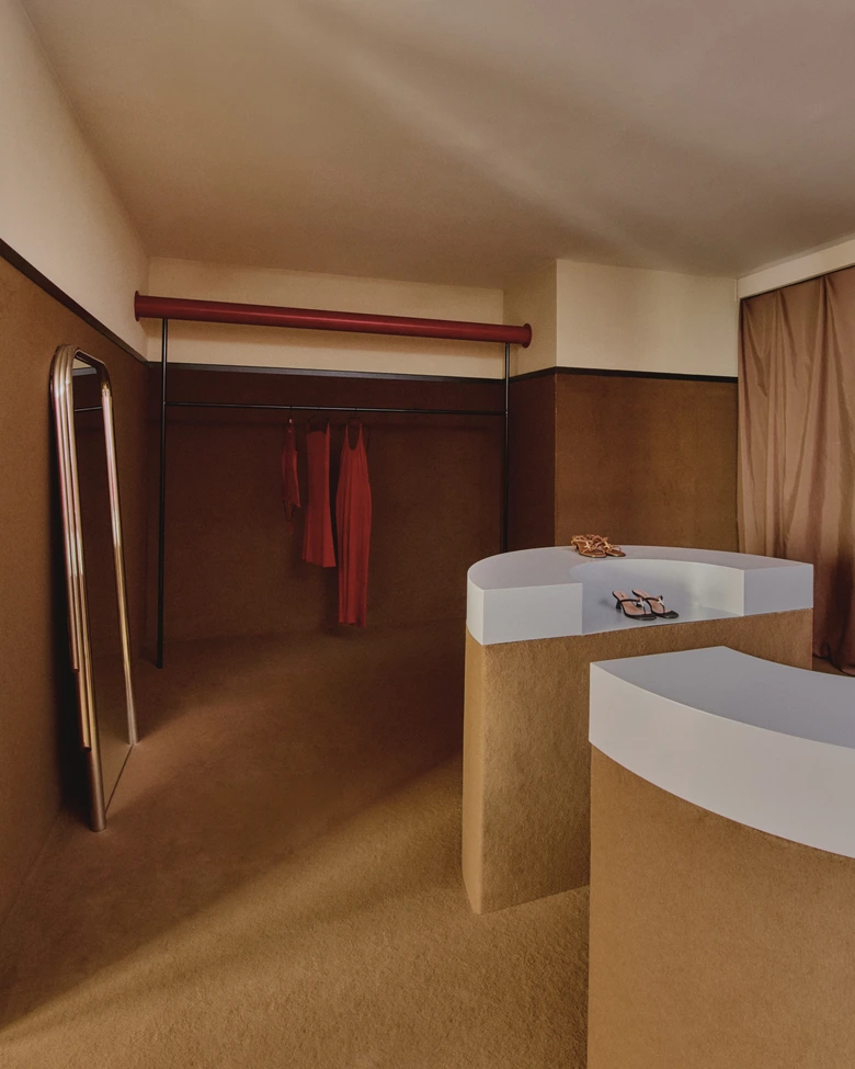 本ポップアップは、<NODALETO>の世界観を五感で体験できる空間を目指し、人々のつながりと創造性を喚起する場として企画されたもの。会場は建築スタジオNecchi Architectureとコラボレーションし、ブランドの進化を象徴するような、リッチなブラウンカラーと質感を特徴とするインテリアに仕上がっている。ポップカルチャーへのオマージュが随所に散りばめられ、<NODALETO>らしい大胆で自由な精神が感じられる空間となっている。