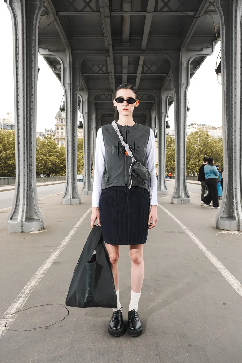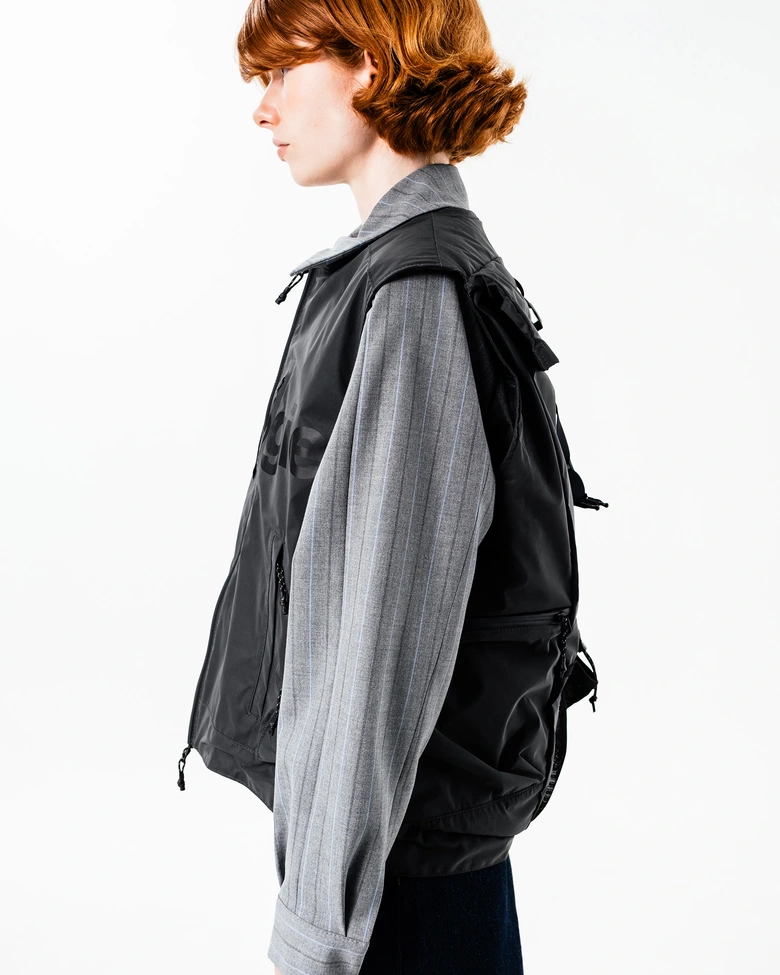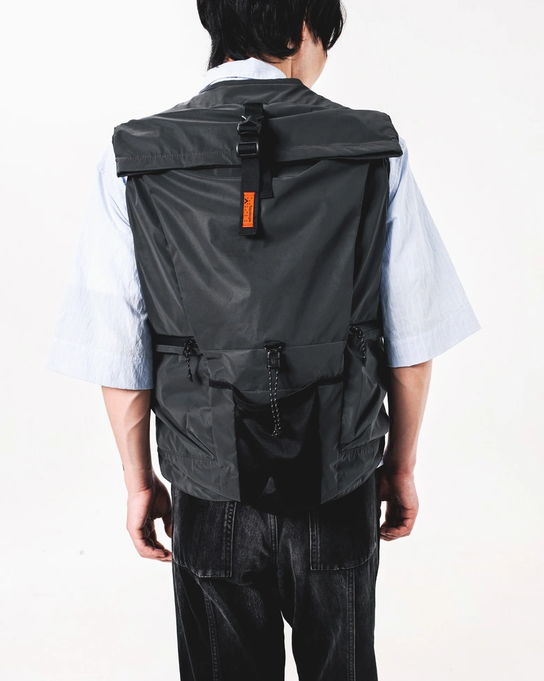 Backpack Vestはたっぷりとした収納スペースを備えており、背面のメインコンパートメントにはマイボトル、タブレット、書類などの大きなアイテムを収納可能。洗練されたカッティングと反射素材を組み合わせることで、フューチャリスティックな雰囲気に仕上がっている。