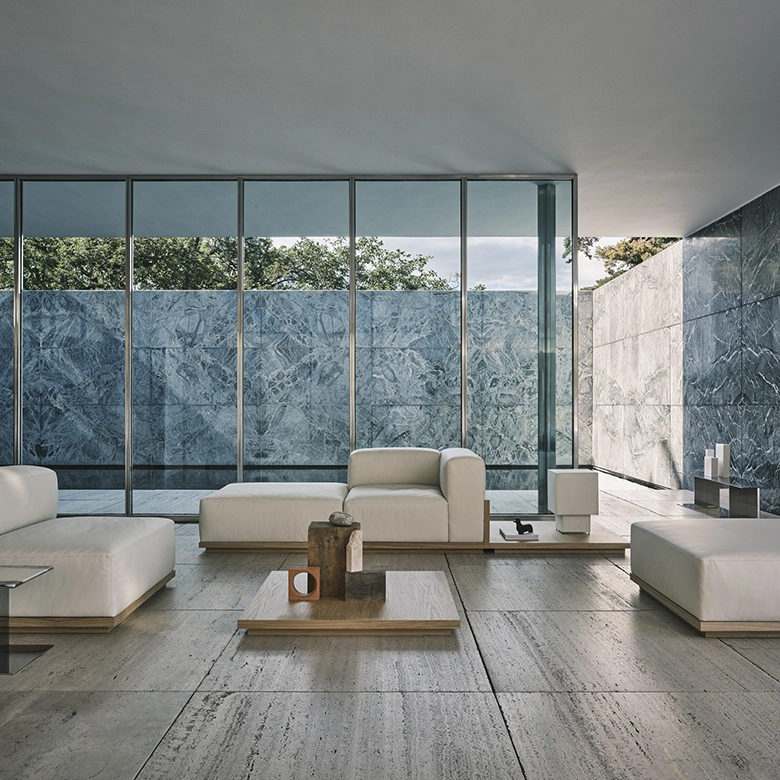 注目アイテムは、自在性をコンセプトに掲げたモジュール式のソファ「SOFA 02」。レザーシートとオーク材のフレームが織り成す構造は、無限の組み合わせが可能で、視覚的な軽やかさと機能性を兼ね備える。