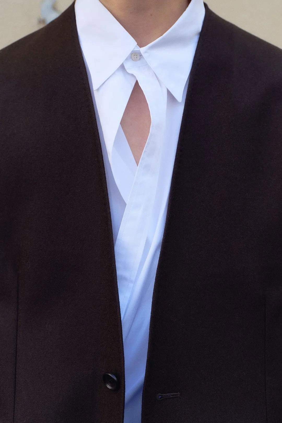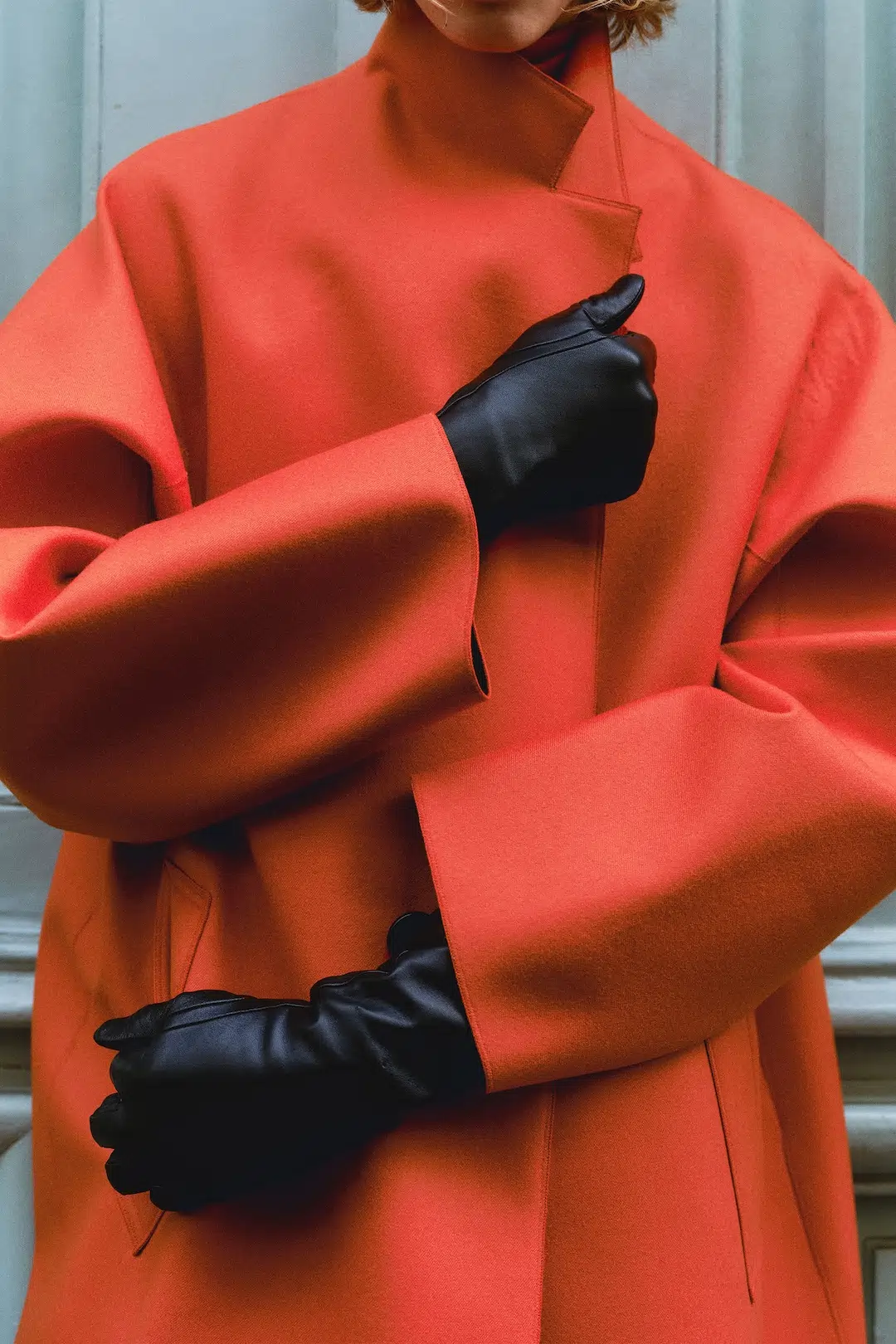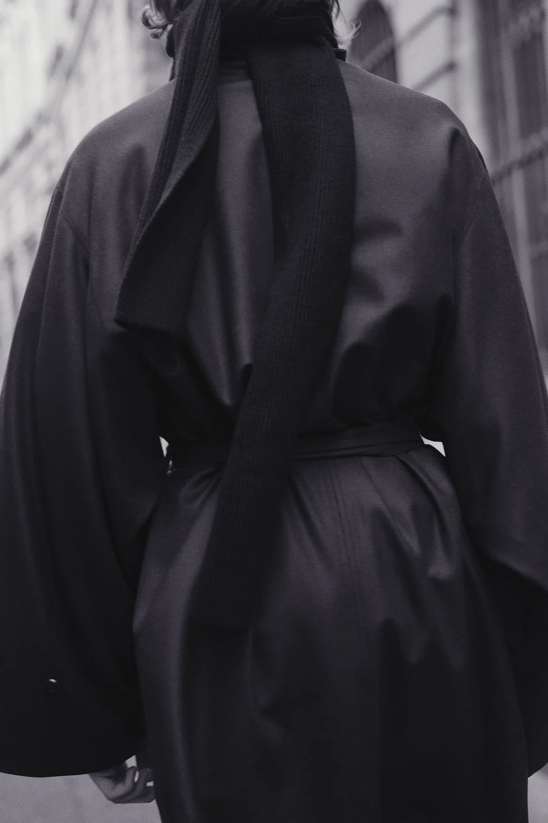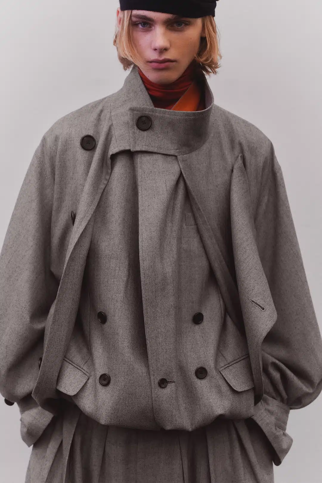 彫刻的なシルエットを描く上衣や、束帯を想起させる外套、そして今季の象徴色ともいえる深い橙が、雨上がりの石畳や柔らかな光の中で浮かび上がる。