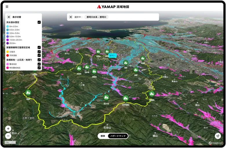 ・Q1「『安全な場所』って、どこ?」という問いに対応するものとして、ヤマップや日本経済新聞社によるビジュアライゼーション作品が、災害の全体像を直感的に伝える。