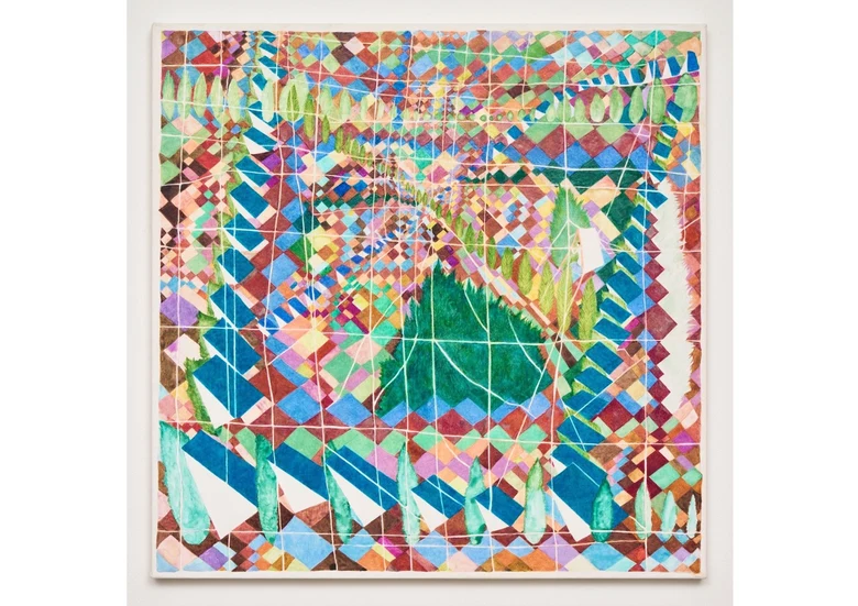 東山詩織《Blue Roofs》2025年、綿布を張ったパネルに白亜地、水彩、色鉛筆、H46×W46cm