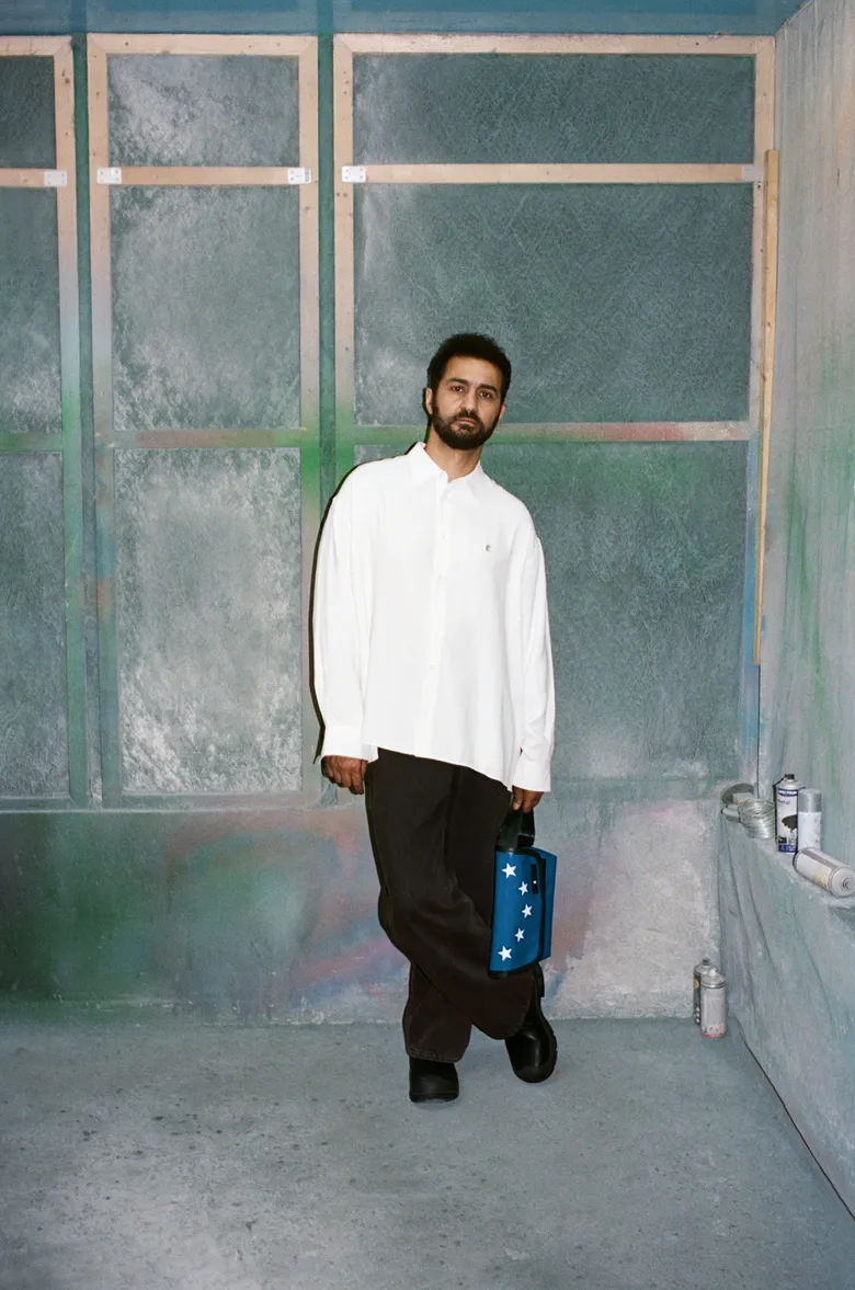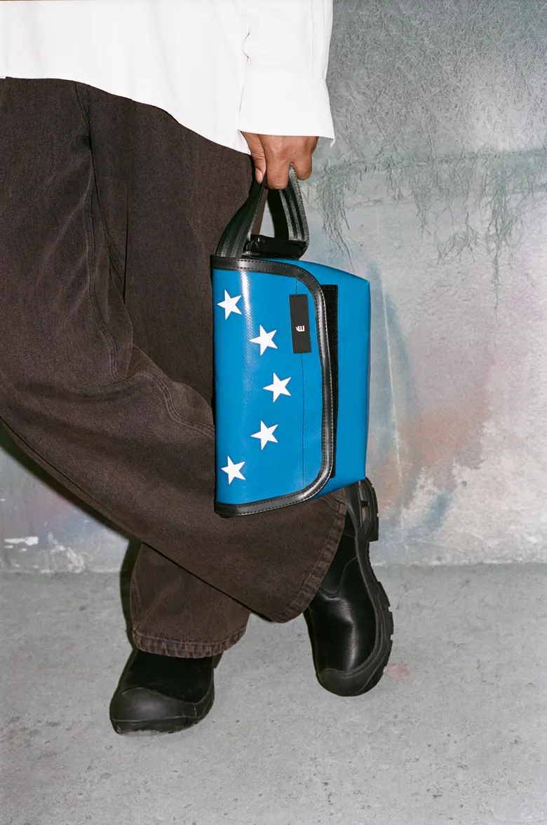 アイコニックなメッセンジャーバッグHAWAII FIVE-0 を再解釈し、厳選されたブルーの色合いのトラックタープを再利用して仕上げられている。すべて路上の痕跡を持つ一点物で、<Études Studio>のシグネチャーである星が手作業でスクリーンプリントされている。これにより生の機能性と視覚的表現との対話を強調している。