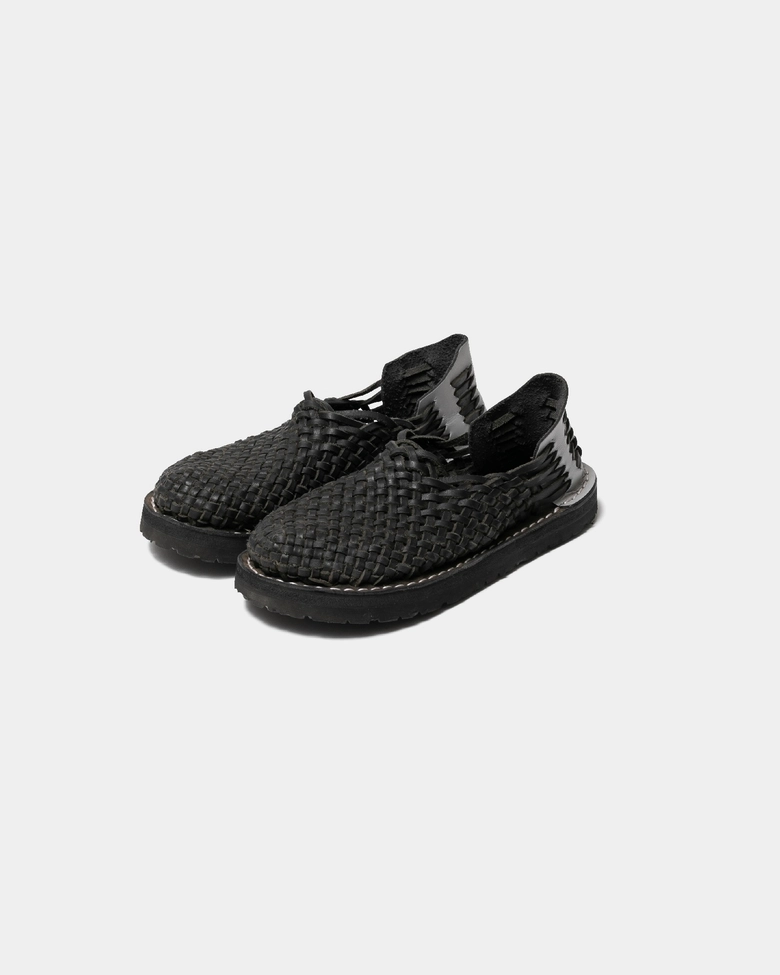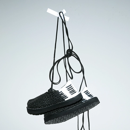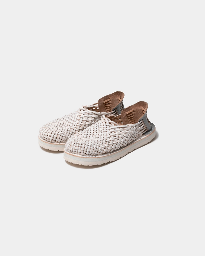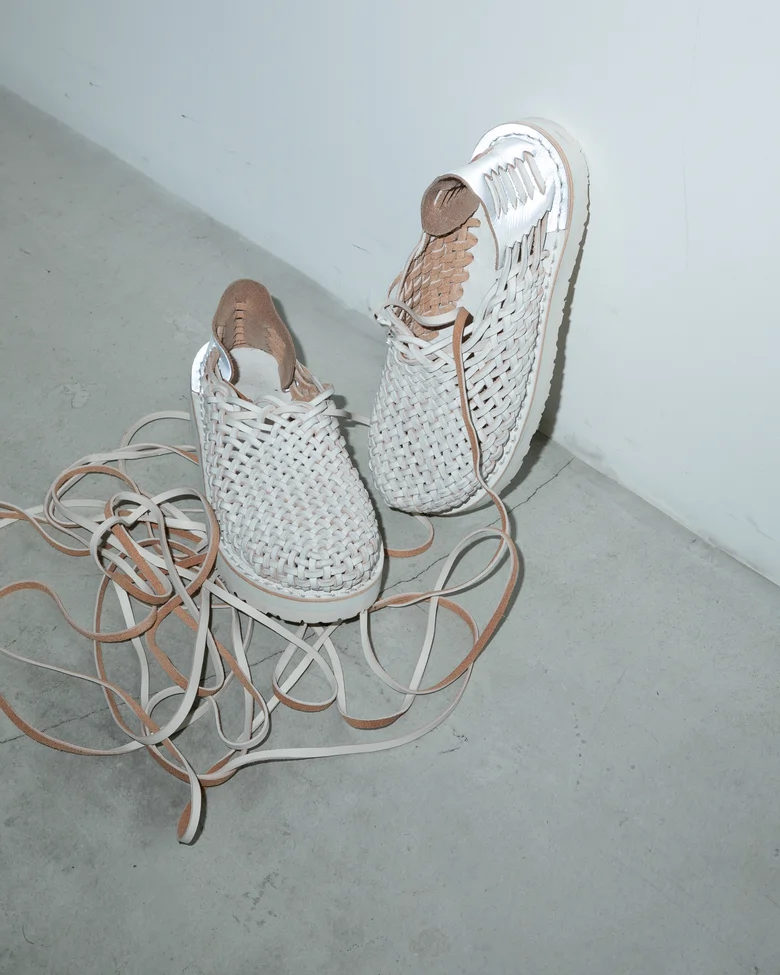 <LA BAUME>は、1989年にポーランド南部の都市クラコフで誕生し、伝統的な革の製法を継承するブランド。特に、1本の革紐のみでアッパーを成形する高度な技術に定評がある。今回のコラボモデルでは、1枚の革を細かく切り、伸ばして作られた1本の長い革紐を使い、職人の手作業によって立体的に編み上げたアッパーが特徴。使用されている革はベジタブルタンニンで鞣された天然皮革で、柔らかな肌あたりと優れた足馴染みを実現している。