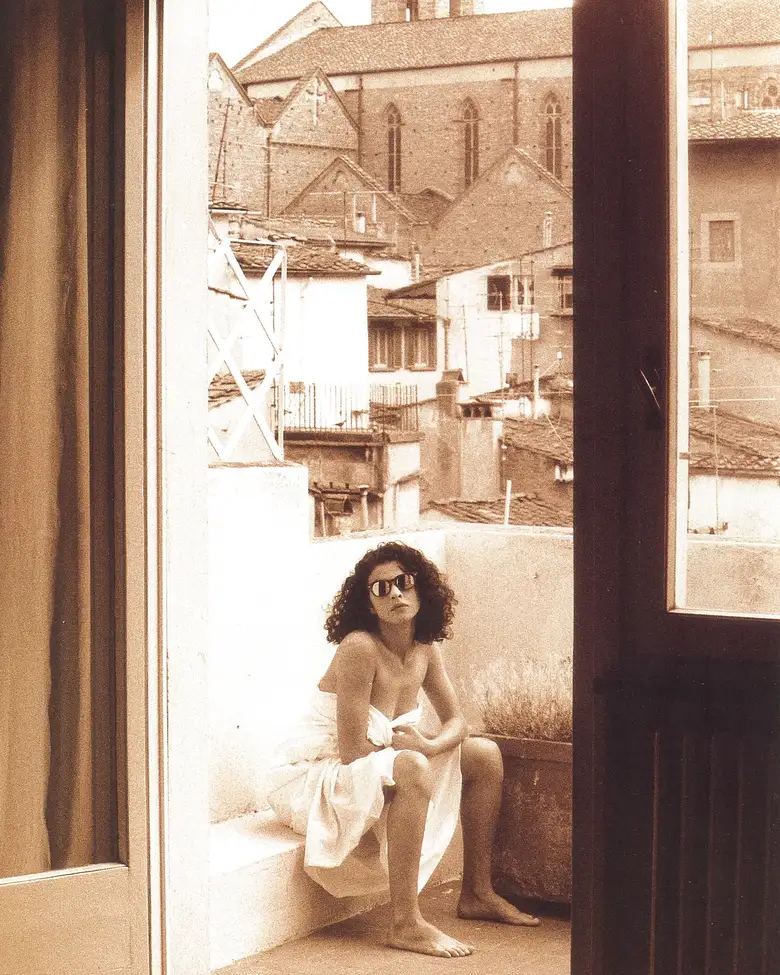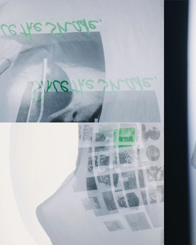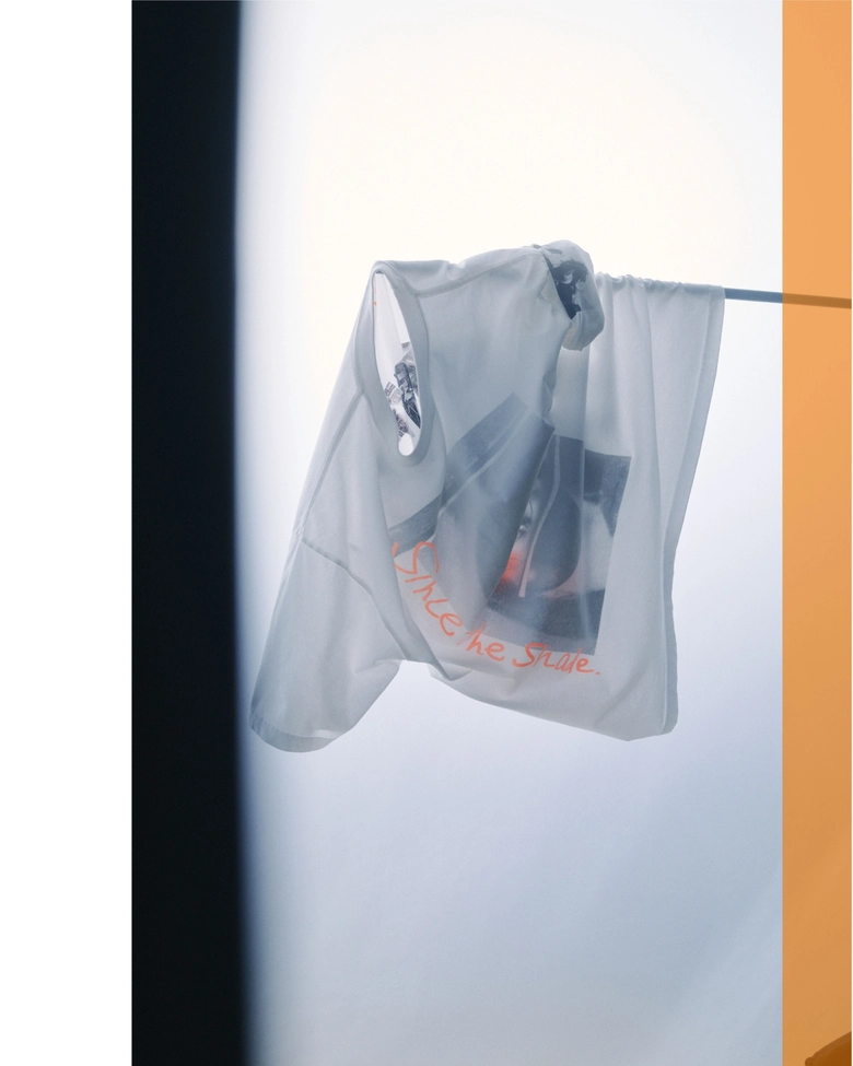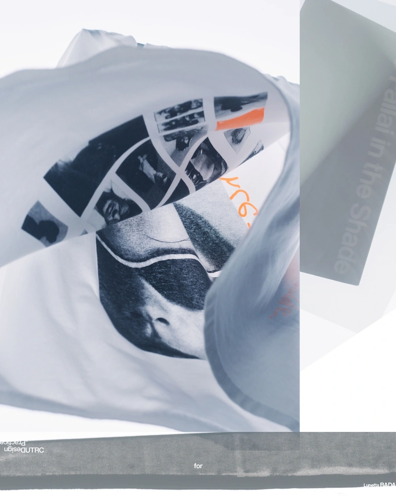 グラフィックTシャツには、<Lunetta BADA>が1989年に出版したブランドブック『Lunetta BADA/Aldo Fallai in the Shade』のヴィジュアルと、「Since the Shade」のグラフィックをシルクスクリーンでプリント。Tシャツの内側に施されたプリントは、インクが光を通して浮かび上がる視覚演出となっており、「陰から新たな創造へ」というメッセージを象徴する仕上がりだ。