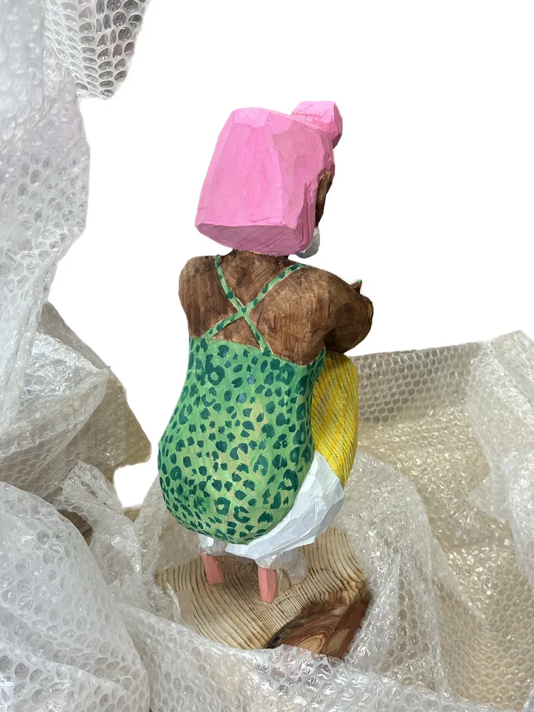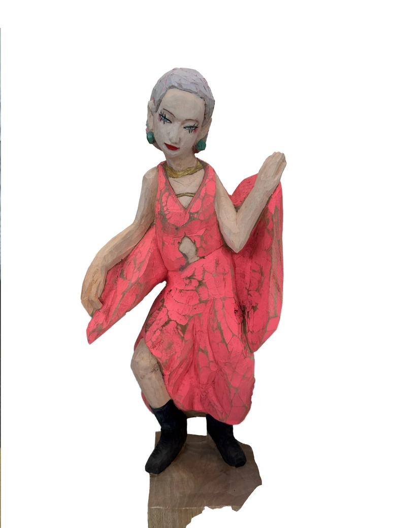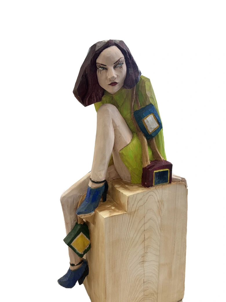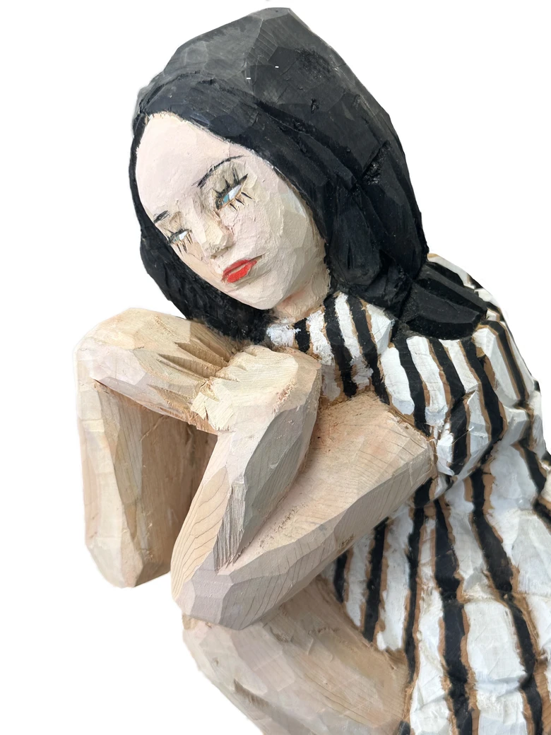 飯沼氏は長野県出身で、国内外で高い評価を受ける彫刻家。彼の作品は一枚の写真からインスピレーションを得て、一木造りで彫り起こされる。木の質感をあえて残したラフな表情と、そこから浮かび上がる静かな感情が特徴であり、現代に生きる女性たちの姿を捉えた造形は圧倒的な存在感を放っている。