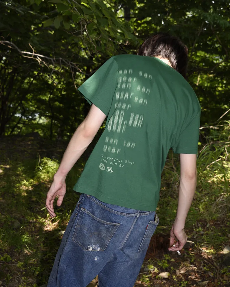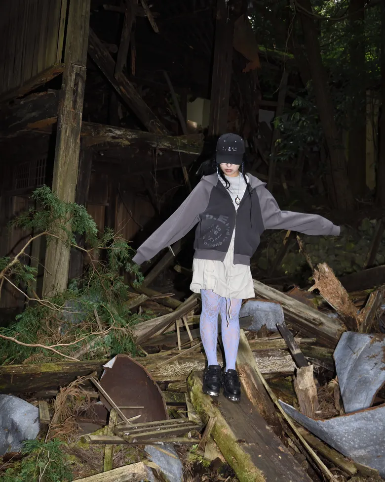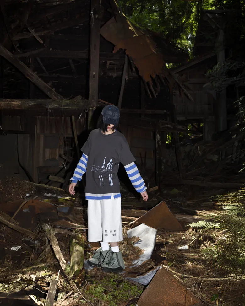 <SAN SAN GEAR>と<b.Eautifulビューティフル>が、コラボレーションコレクション「In the Haikyo...」を発表した。ともにサブカルチャーを基盤としており、本コレクションでは特に「廃墟萌え」というテーマを中心に据えている。「廃墟萌え」とは、時の流れによって朽ちていった空間に独特の美しさや魅力を見出し、それを探索・愛好するオタク的文化を指す。<SAN SAN GEAR>と<b.Eautiful>はこの文化をひとつの現象として受け止め、お互いの視点と強みを掛け合わせることにより、新たな解釈によるコレクションを完成させた。
