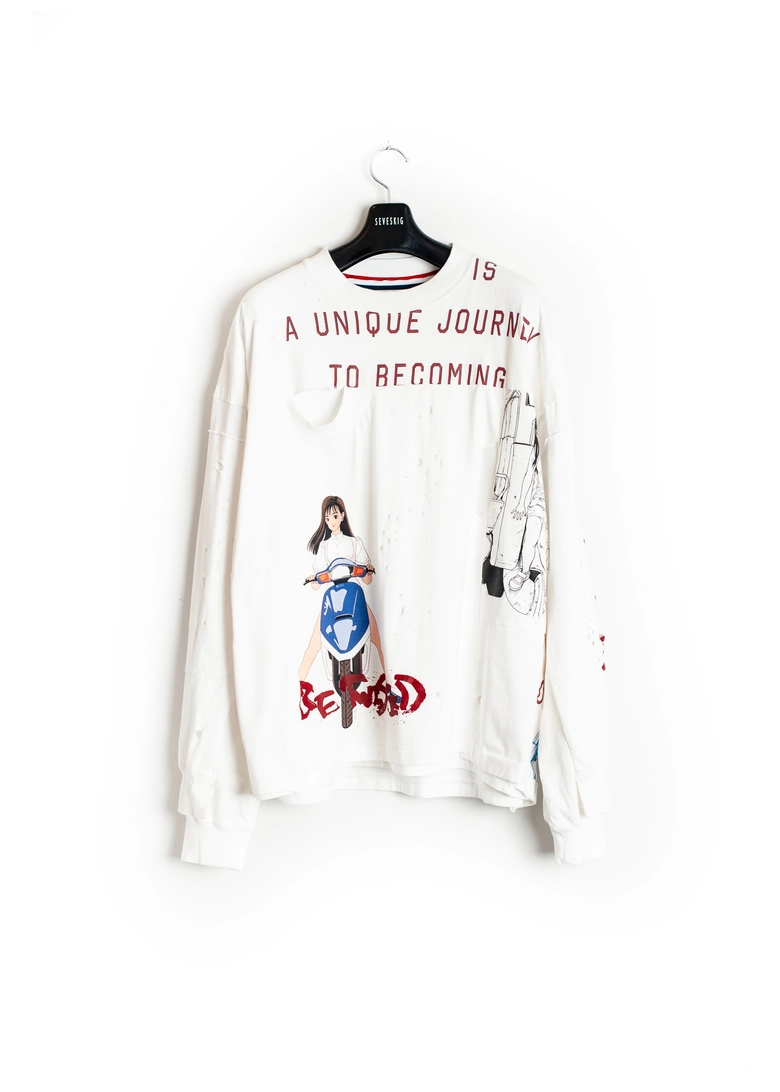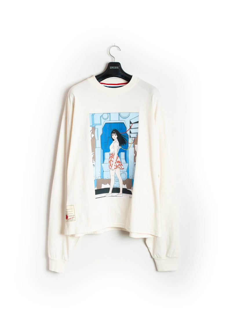 内容:江口寿史のグラフィックを大胆にプリントしたTシャツを解体・再構築し、パッチワークで仕立てたロングスリーブTシャツ。前後で異なるイラストのズレや重なりが、唯一無二の存在感を放つ。