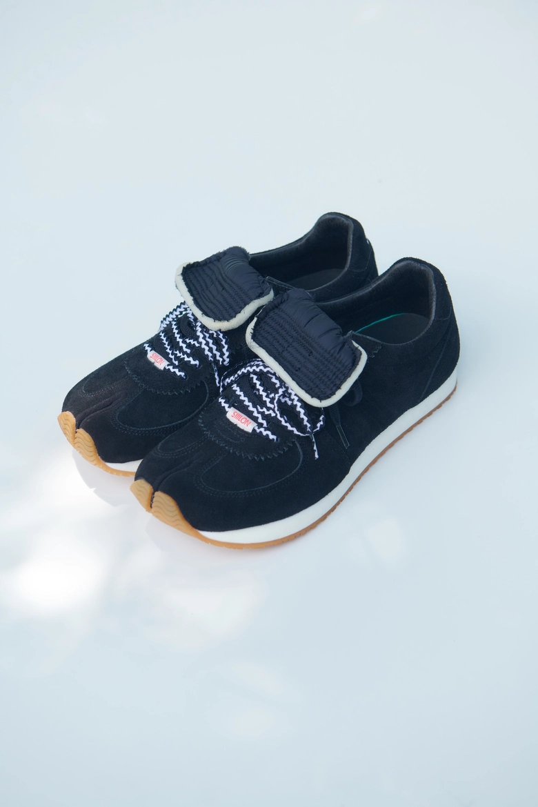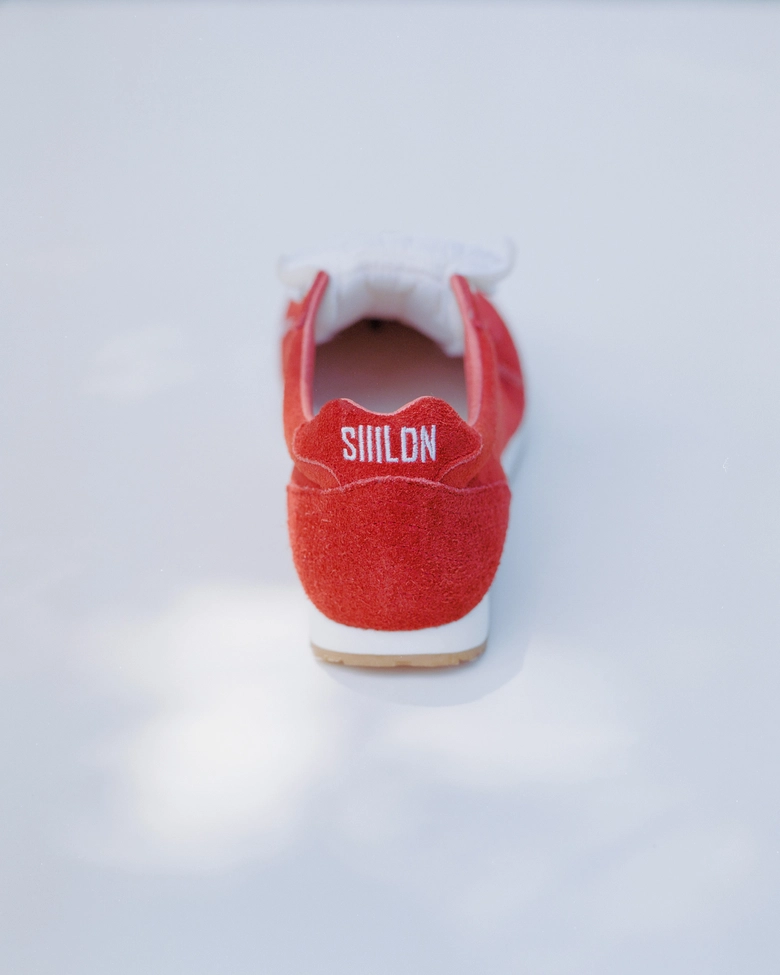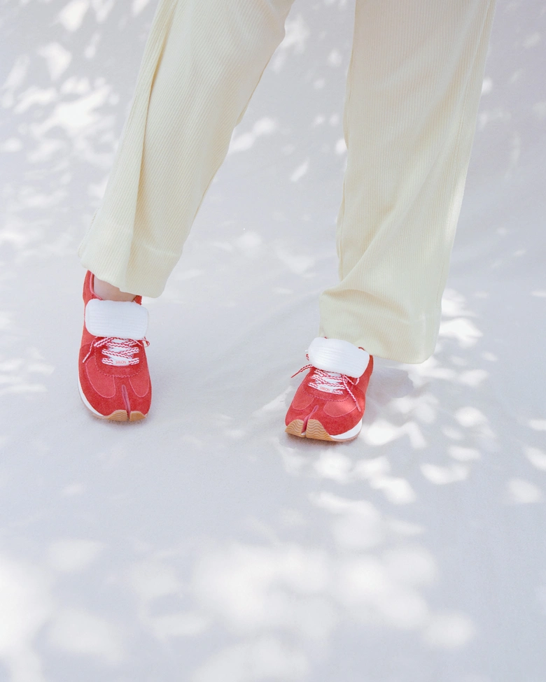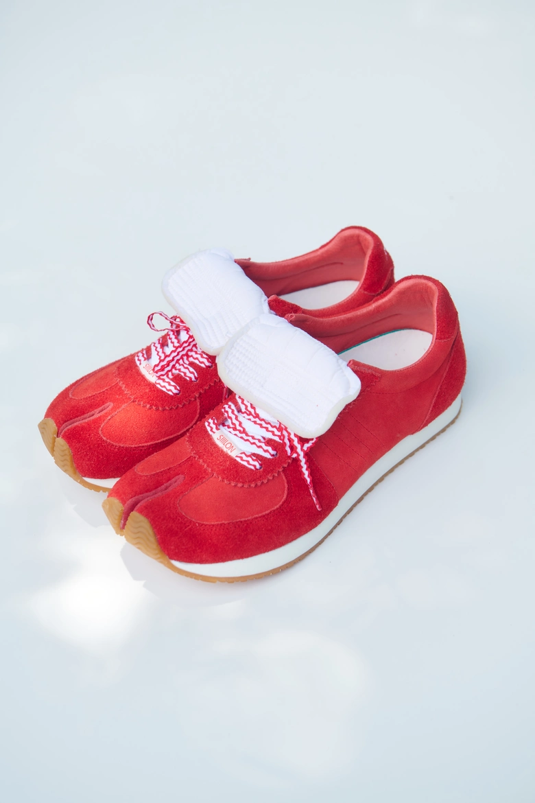 【Tabië】は、日常を旅に変えるというコンセプトのもと、足袋の指使いによる快適な履き心地と、<SIIILON>らしい“kawaii”世界観を融合させた一足。ヴィンテージのジャーマントレーナーやスポーツシューズから着想を得たデザインに仕上げられており、ベロアスウェード素材のアッパーや、異素材を組み合わせた2本のシューレースなど、細部にも遊び心が光る。