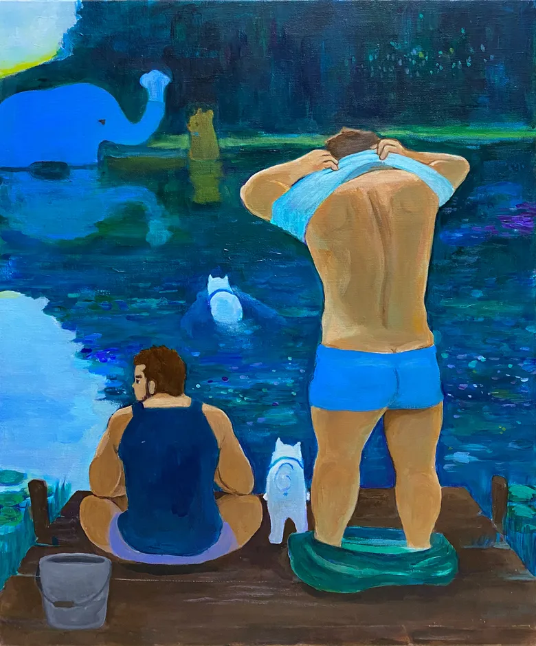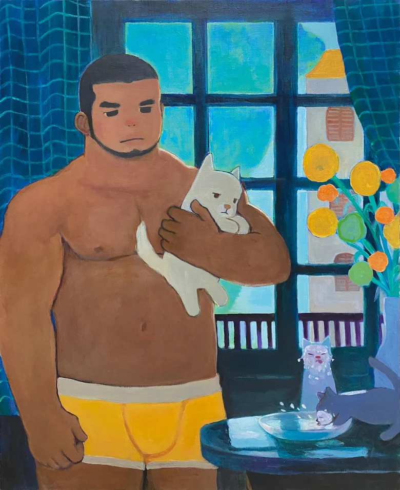 武蔵野美術大学造形学部日本画学科卒業後、ニューヨークに留学。帰国後はグラフィックデザイナーとして働きながら、デジタル作品や油彩、アクリル画を精力的に制作。セクシャルマイノリティとしての経験をもとに、鍛えられた肉体をもつ青年たちの内面の葛藤や孤独を描く。その傍らには、社会の中で揺らぐ彼らに静かに寄り添う動物たちの姿も描かれ、見る者に深い共感と余白を残す。柔らかなタッチと色彩が、静かで確かなまなざしとともに、見る者の感情をそっと揺らす。