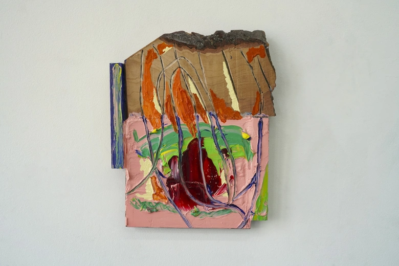 平野啄也は、日々のアシスタント業務で生まれる廃材に着想を得て、額縁を制作する過程と、そこに偶然性を持って残された痕跡に着目した作品を発表。本来の役割から離れたフレームが、外枠と中身という物質として立ち現れることで、知覚の認識の再構築を試みる。