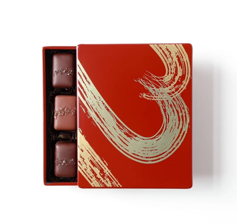 世界中のチョコレート愛好家に愛され続けているフランズチョコレートの代表作・ソルトキャラメルを、漆器の老舗「山田平安堂」の美しい漆箱で包んだ特別な一品。一つひとつ職人の手仕事によって仕上げられた漆器は、食べた後も小物入れやジュエリーボックスとしても使うことができる。