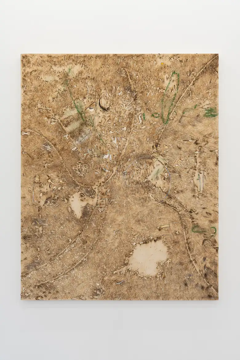 Ichi Tashiro. Untitled. 2025. Oil stick, oil pencil, and charring on cotton canvas and wood. 1620 x 1303 x 35 mm. Courtesy of Gallery Common.