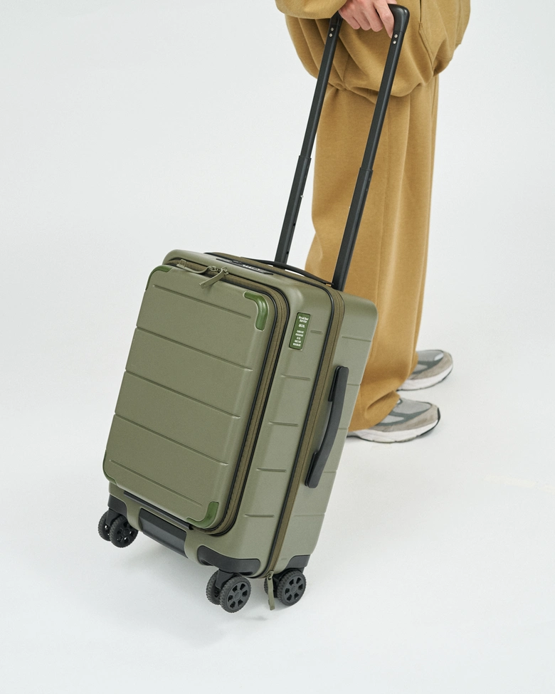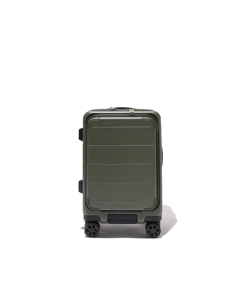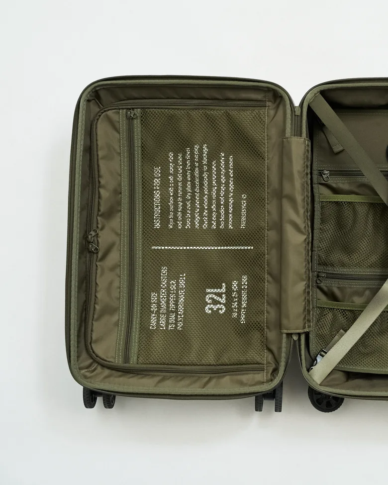 日本の老舗ラゲージメーカー「ace.」との別注商品。32L機内持ち込みサイズのスーツケース。悪路でも安定走行できる大型双輪ホイールと2通りの開閉方式で高い実用性を実現。軽量3.5kgで、収納力と整理力に優れた2〜3日の旅行に最適な一台。