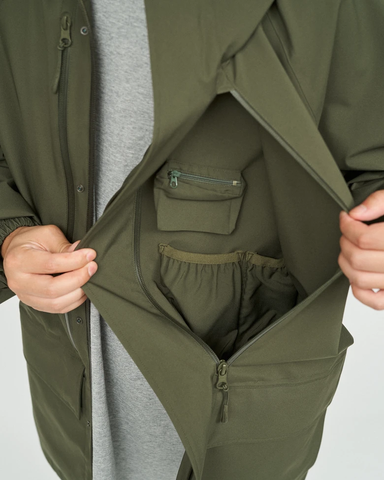 撥水・透湿性に優れたオリジナル3レイヤー素材を使用したアウター&パンツ。ジャケットはフロントには縦型ジップでアクセスできる内ポケットシステムを搭載。モバイルフォンやバッテリー、パスポートなど旅先の必需品をスマートに収納できる。パンツにも裾のドローコードやキー用のループが備わっている。旅先での盗難や天候の変化にも柔軟に対応する、頼れる一着になっている。