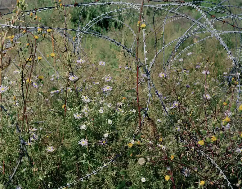 米田知子《絡まった有刺鉄線と花(非武装地帯近く・チョルウォン・韓国)Ⅰ》2015 年 発色現像方式印画 作家蔵