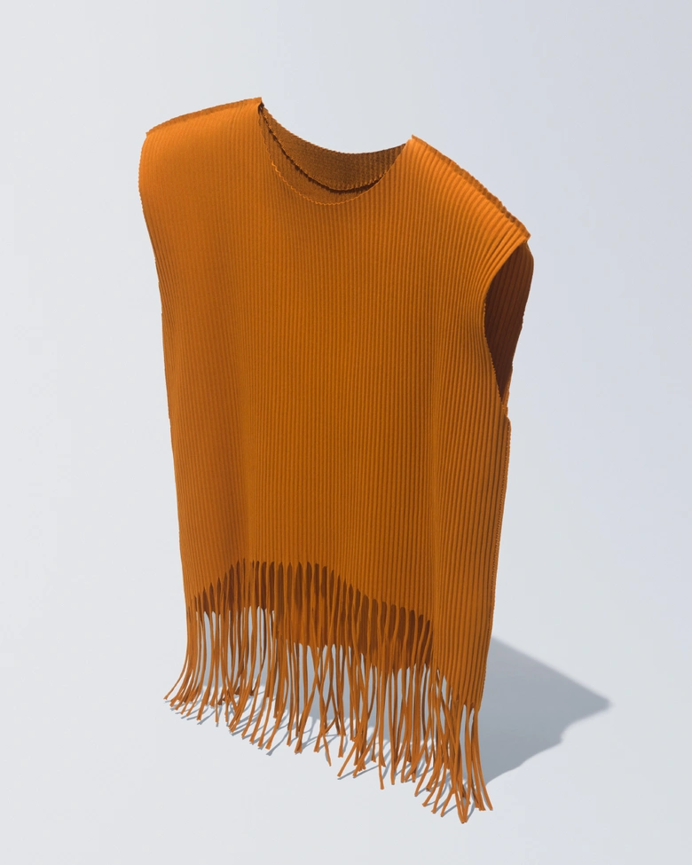 裾に配した細かなフリンジが特徴のファインニットプリーツ。アーチ状に配したフリンジが動きを生み、インナー次第で多彩なスタイリングが楽しめる。