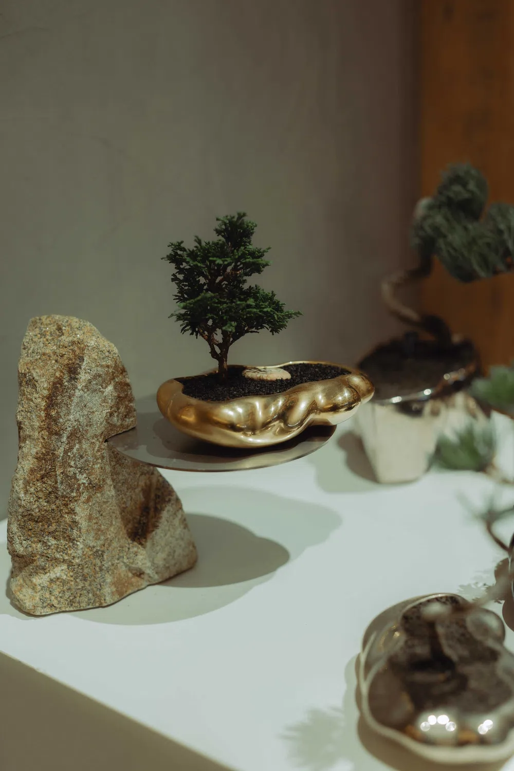 「盆栽とそのまわり」をテーマに、盆栽を置くスペースや演出したいイメージに合わせて、盆栽・器・台座を自由に組み合わせることができるプロダクトを展開。国内の盆栽職人によって丁寧に育てられた盆栽と、陶芸・彫刻などそれぞれの分野の作家と生み出す<KOKON>オリジナルの器・台座。盆栽・器・台座を組み合わせて置くことで、そこに一つの風景が完成する。