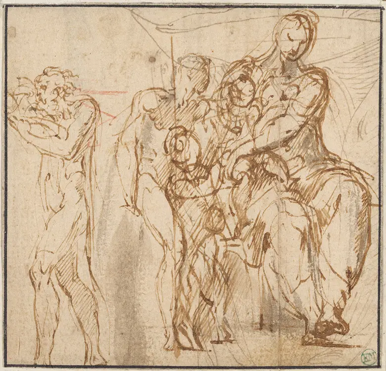 パルミジャニーノ (フランチェスコ・マッツォーラ) 《聖ヨハネと男性聖人を伴う 「長い首の聖母」のための習作、 左に向かって歩く男性》 ©Cecilia Heisser/Nationalmuseum